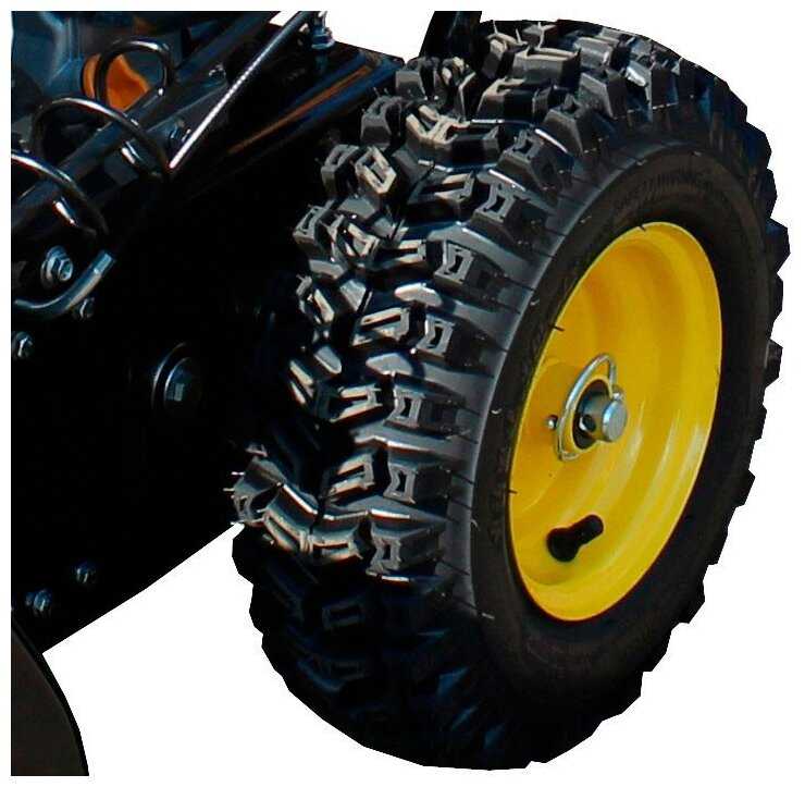 Шины с агрессивным протектором обеспечивают хорошее сцепление на рыхлом снегу, но на льду возможна пробуксовка. Пользователи рекомендуют утяжелить конструкцию, закрепив грузы на раме, либо использовать цепи противоскольжения. Для сложных условий подходит скорость 1-2, где крутящий момент максимален. -