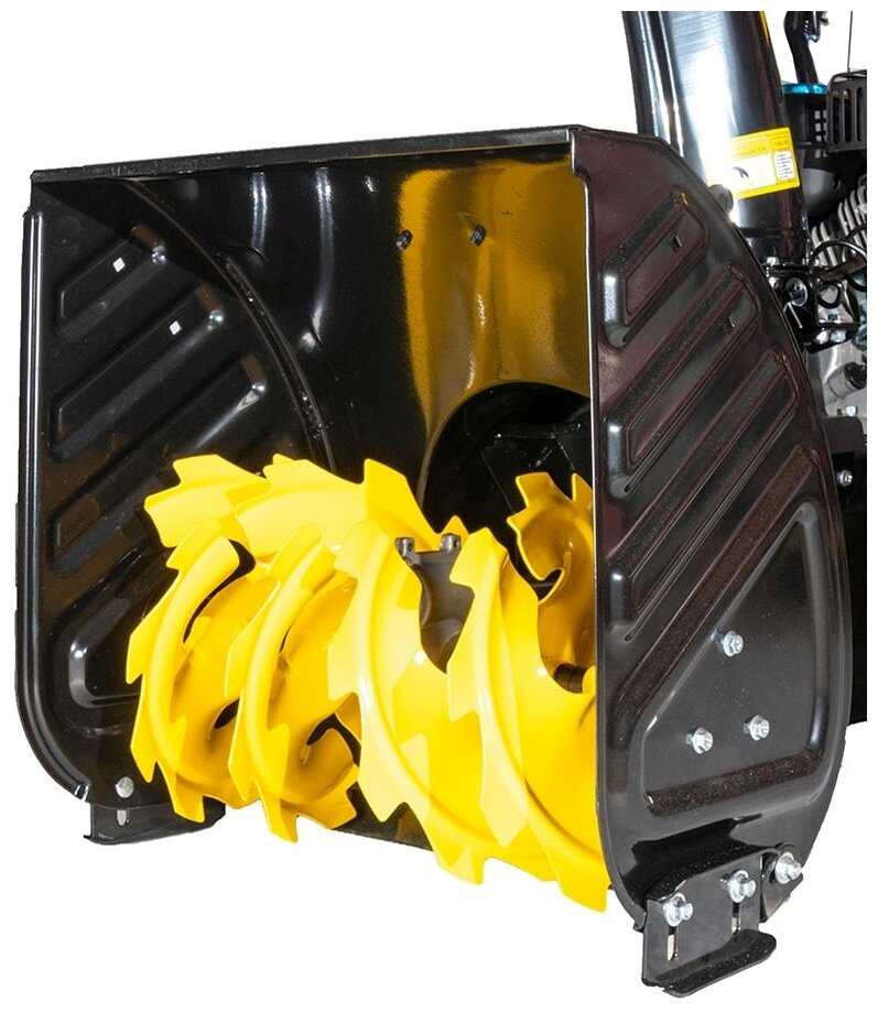 - Система шнеков с зубчатой структурой из прочного металла справляется не только с рыхлым, но и слежавшимся снегом, измельчая его до состояния крупы.