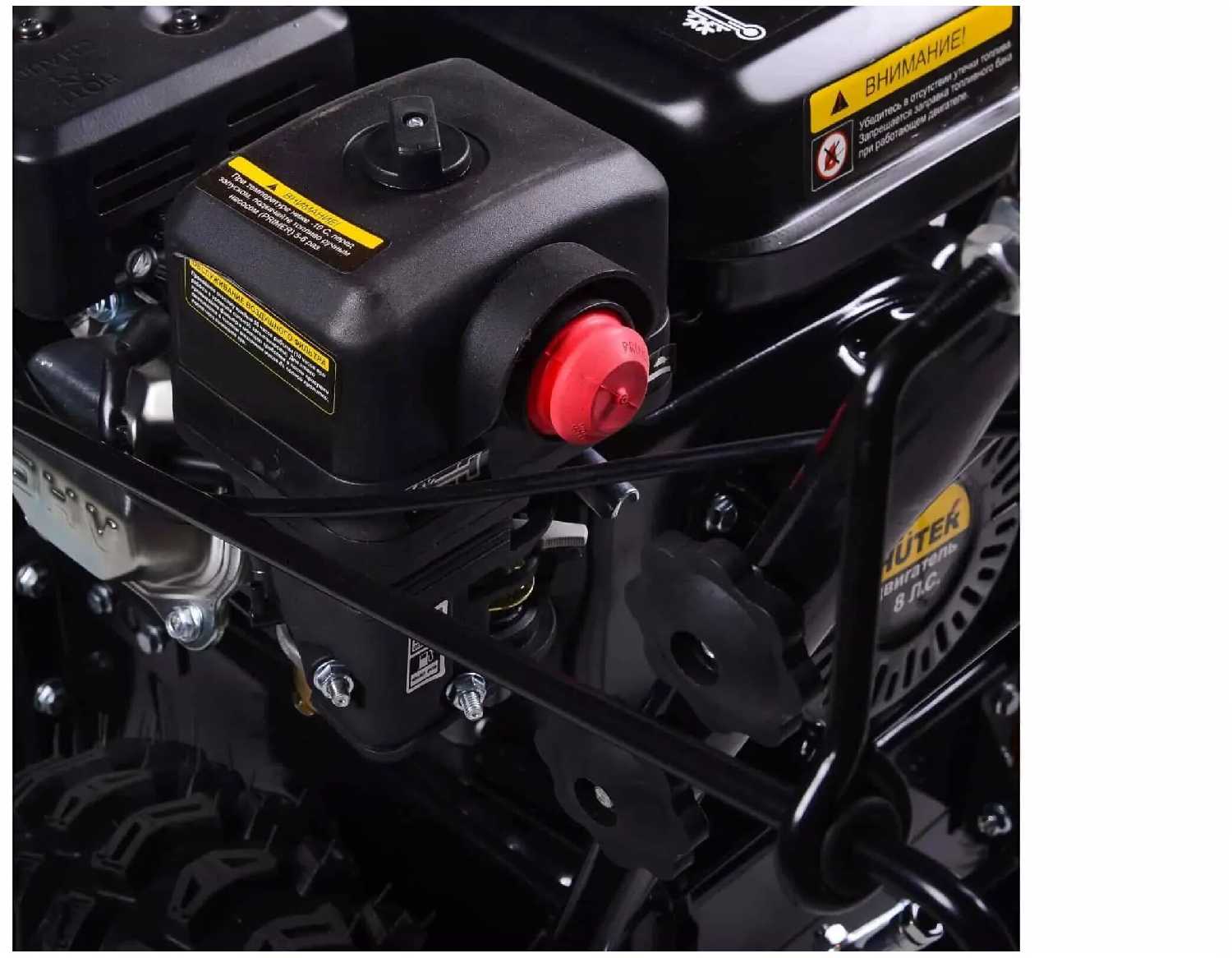 Четырёхтактный двигатель мощностью 8 л.с. демонстрирует неоднозначную надёжность. Электростартер работает стабильно даже при -25°C, что спасает пользователей, так как ручной стартер часто выходит из строя: пластиковая ручка ломается после 5–6 использований, а сам механизм отказывает на морозе ниже -10°C, вопреки заявленным -30°C. Карбюратор склонен к засорам даже при кратковременном простое, что приводит к плавающим оборотам и необходимости частой чистки. Наблюдаются проблемы с подачей топлива при наклоне агрегата — если бак заполнен менее чем на половину, двигатель глохнет. Пользователи отмечают, что качество бензина критично: при использовании низкосортного топлива возникают перебои в работе. Расход топлива считается умеренным — полного бака хватает на 2–3 дня уборки при средних нагрузках.