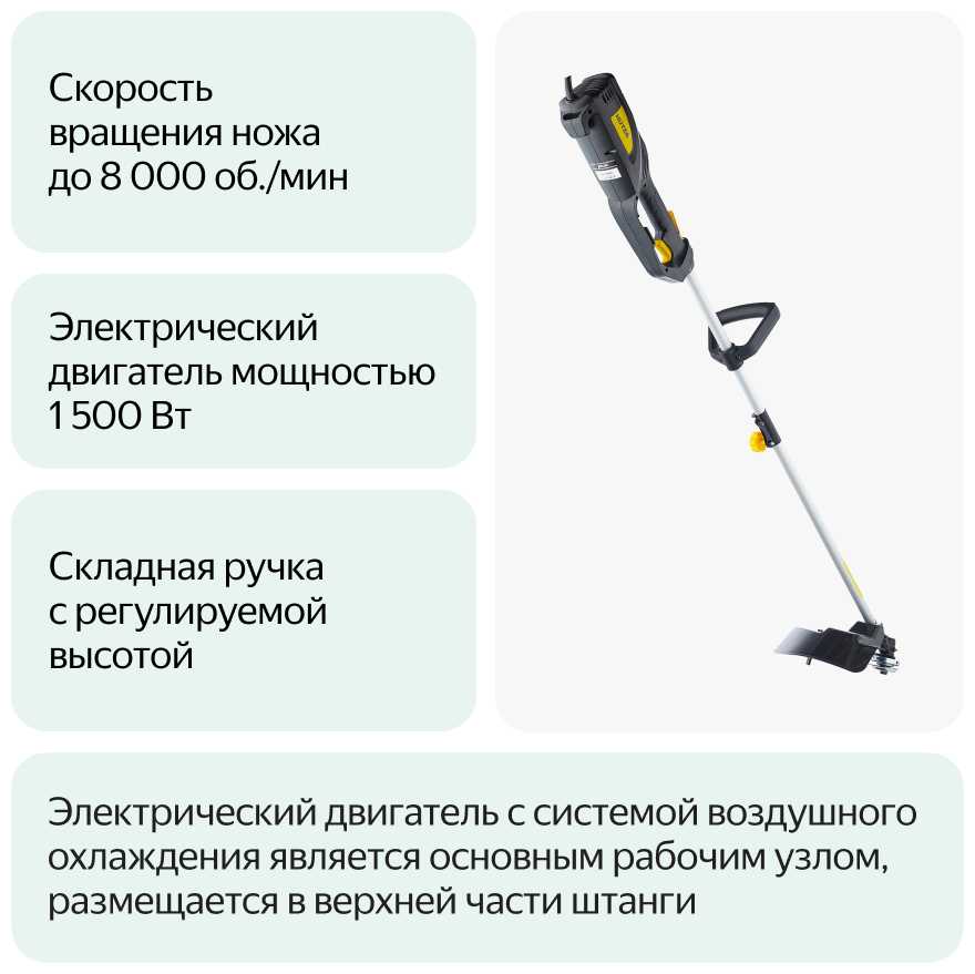- Высокая мощность двигателя (1500 Вт) для эффективного кошения густой травы и кустарников: