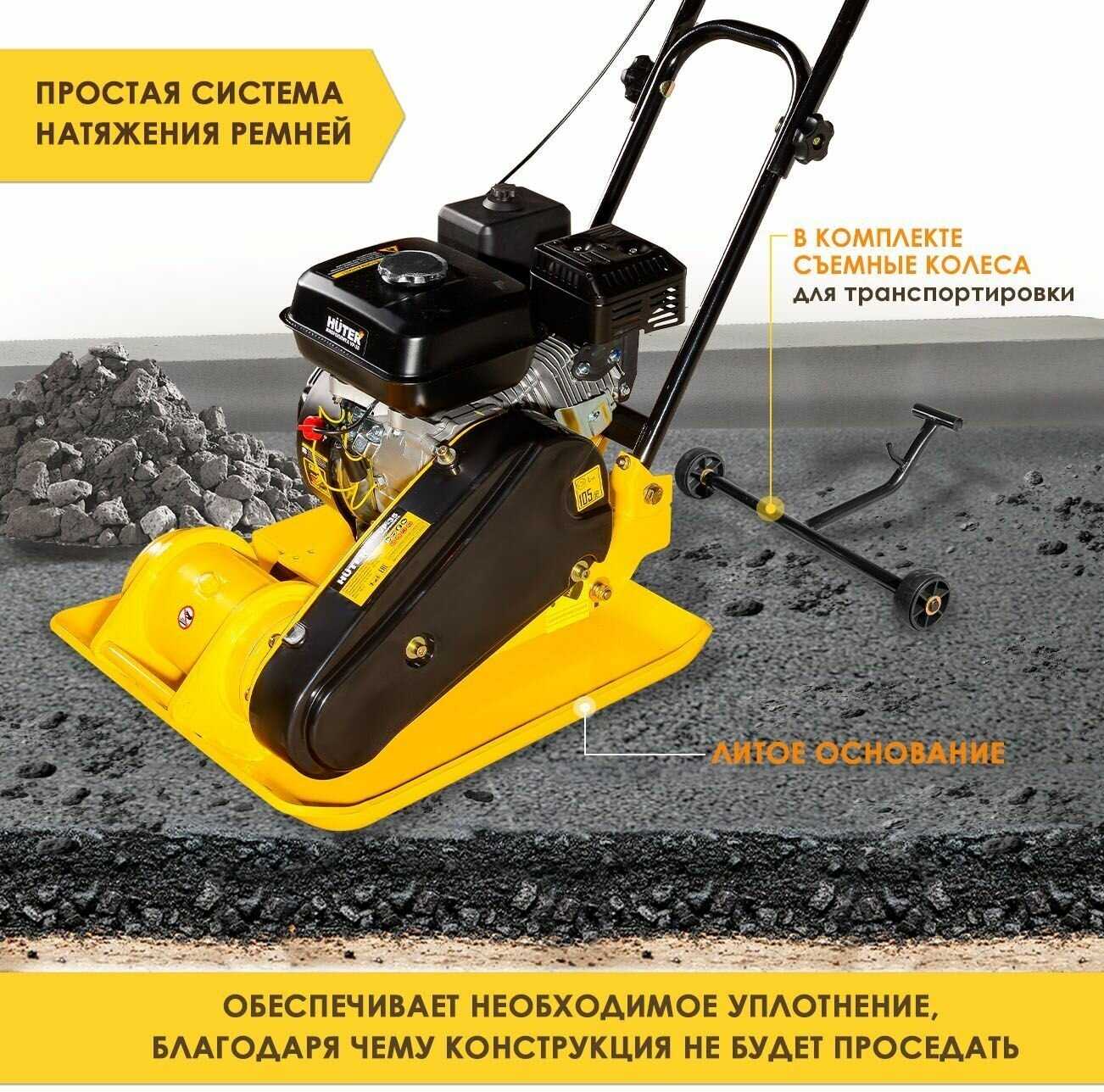 - + Мощный бензиновый двигатель, отличный уплотнитель для грунта и сыпучих материалов. Удобная рукоятка и съёмные колеса — перемещать легко.