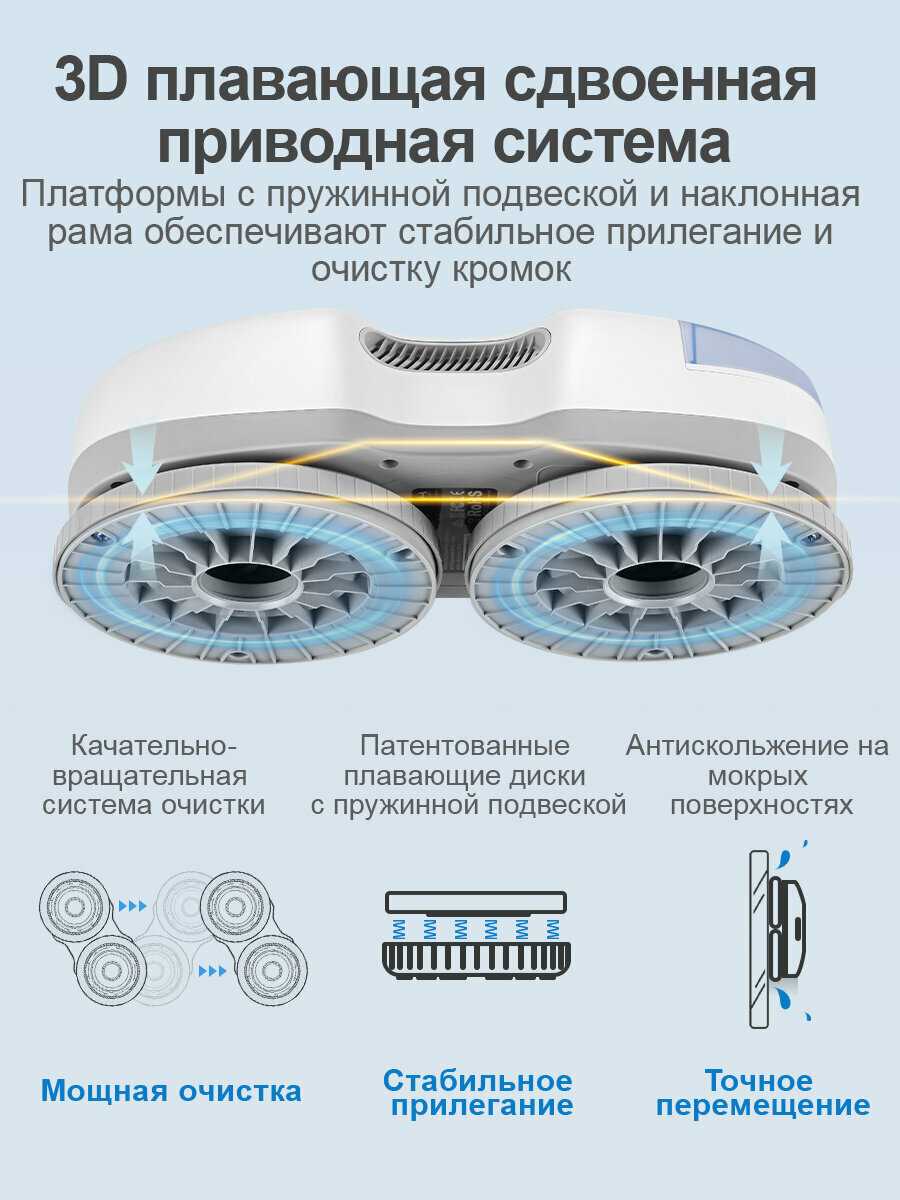 | Особенности : | автоматическая остановка, автоматическое определение зоны уборки, мойка безрамных поверхностей, обход препятствий, светодиодная индикация |