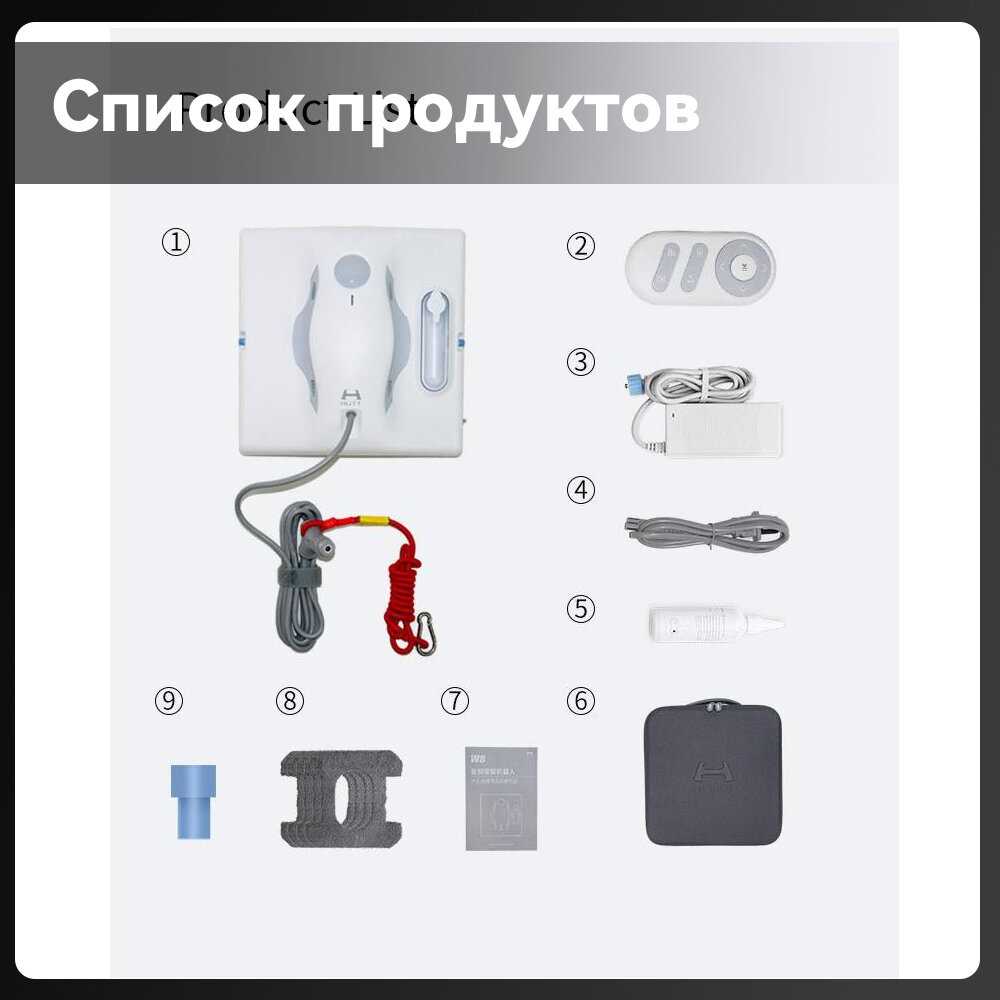 В комплекте : | адаптер питания, моющая тряпка, пульверизатор, пульт ДУ, страховочный шнур |