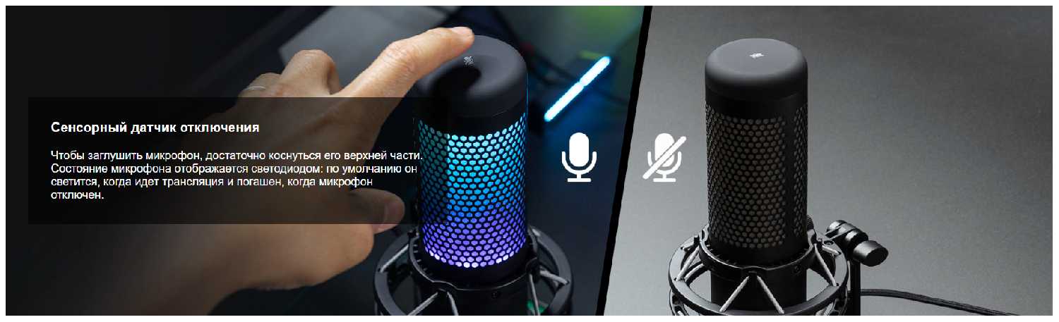 - Мгновенное включение/выключение микрофона с подсветкой-индикатором, что исключает риск случайных пауз или "забытого" мута.