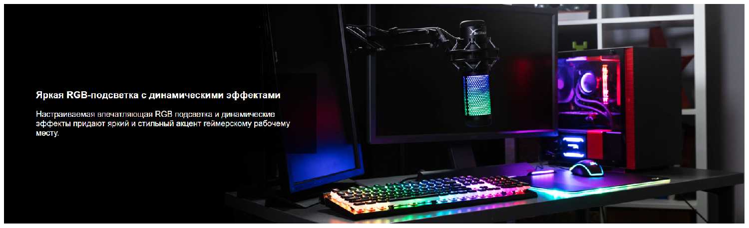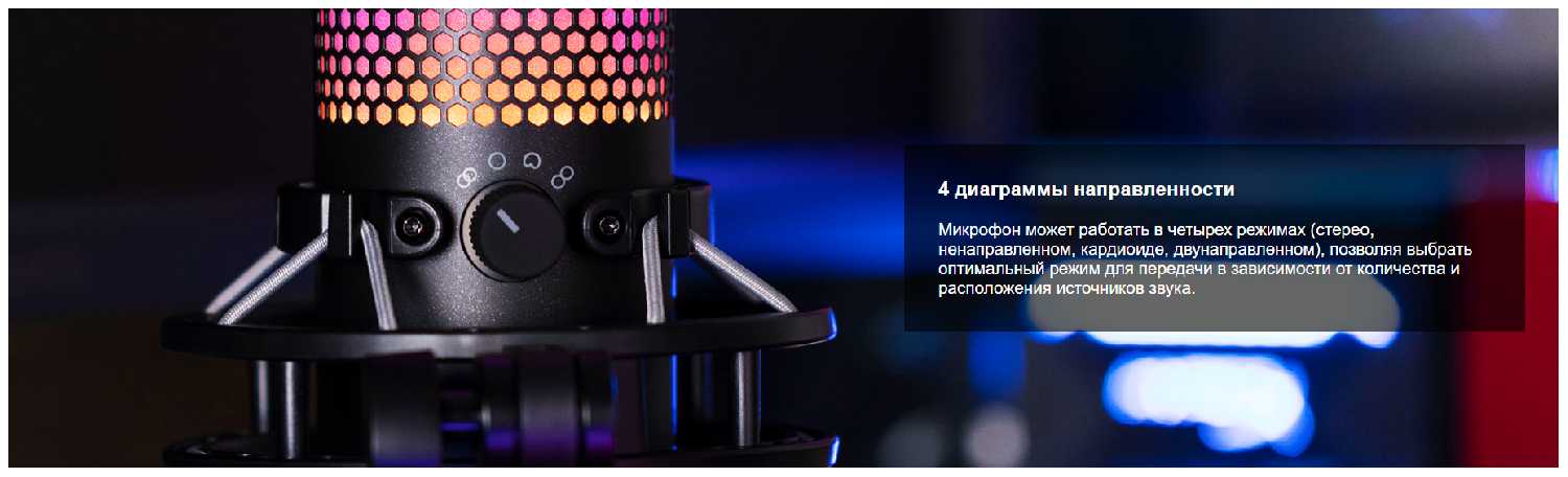 Еще одна замечательная особенность - встроенная подсветка. Микрофон имеет RGB-подсветку, которая добавляет эффектности и атмосферности к вашему рабочему пространству.