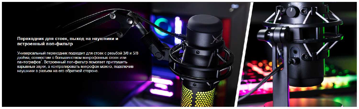 - Жесткое крепление микрофона в подвеске предотвращает случайные смещения, сохраняя стабильность позиции.