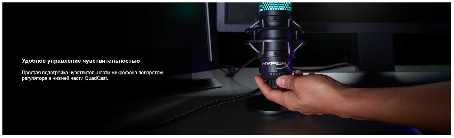 Кроме того, микрофон HyperX QuadCast обладает удобной регулировкой громкости прямо на корпусе. Вы можете легко изменить уровень звука во время использования без необходимости переключаться на другие устройства.