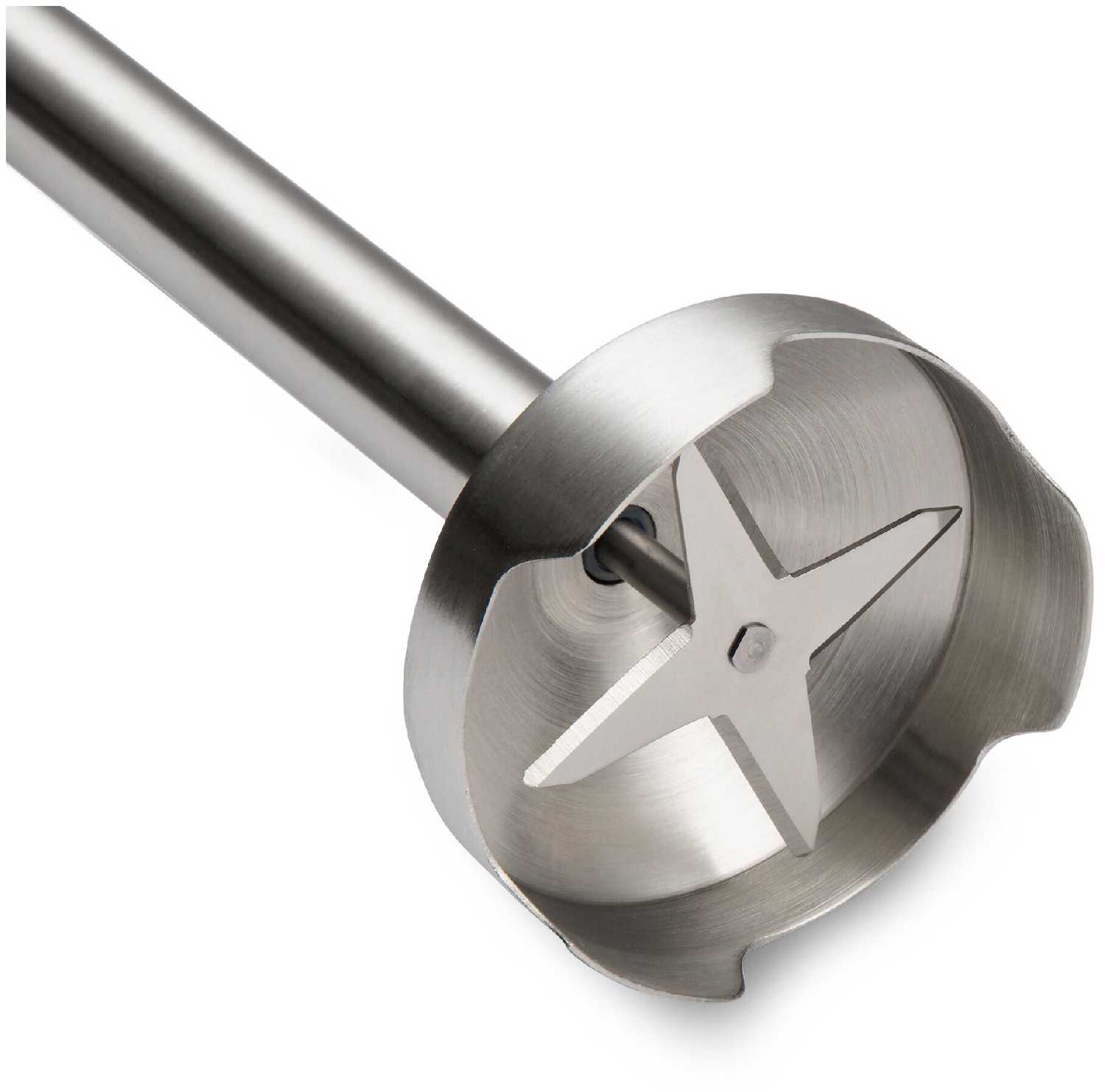 - Нержавеющая сталь в ножах и погружной части повышает долговечность: