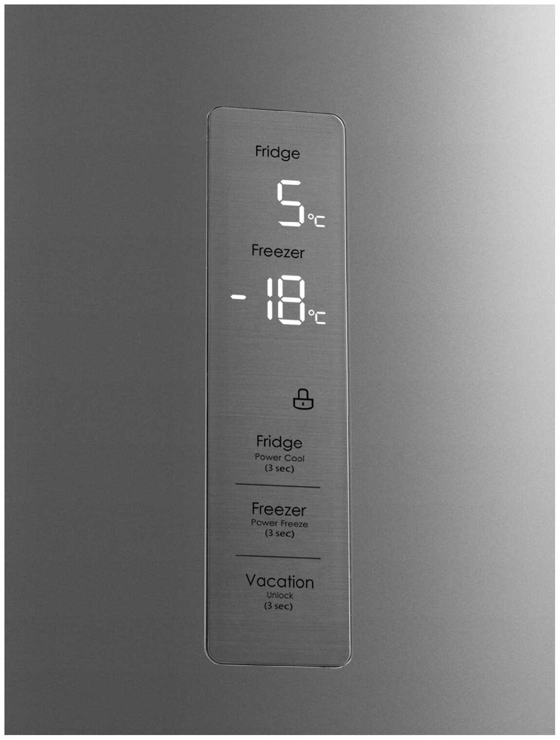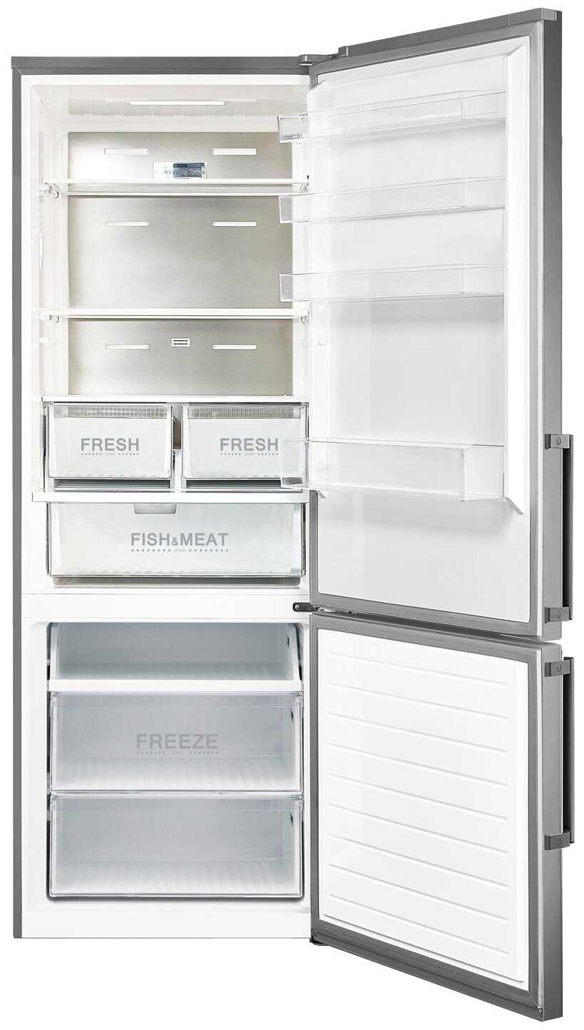 Внешний вид очень стильный, холодильник стального цвета, ручки и панель управления отделаны под титан. В холодильном отделении три открытых полки, два отдельных ящика для овощей и фруктов, расположенных параллельно, самый нижний ящик для свежих продуктов. Впечатления только положительные, не шумит, вместительный.