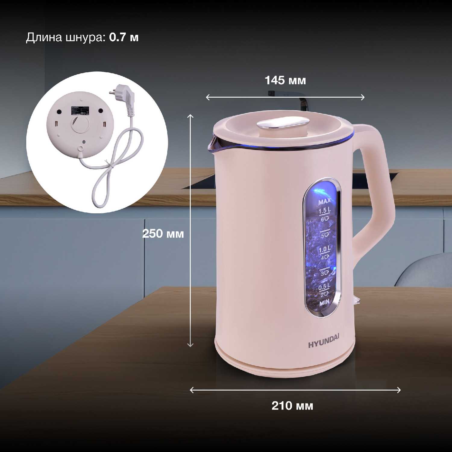 Объём чайника составляет 1.5 литра, что является стандартным и вполне достаточным для большинства потребностей. Пользователи подтверждают, что этого хватает, чтобы приготовить кипяток для 4-6 стандартных чашек объёмом 250 мл, то есть на небольшую семью или компанию коллег на работе. Для одного-двух человек этот объём更是 считается более чем комфортным. -