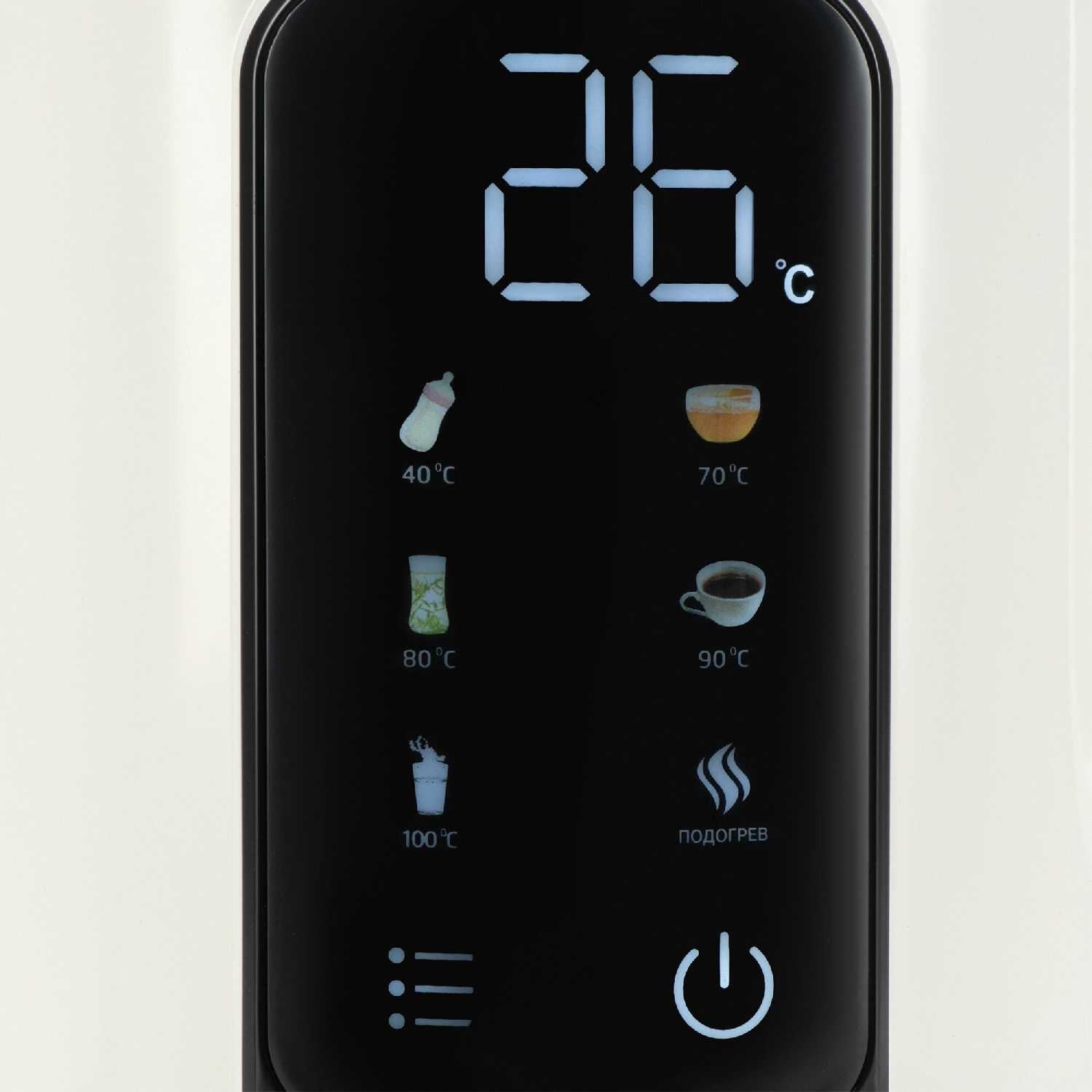 - + Качественная сборка, возможность выбрать температуру воды, внутри колба металлическая, за счет чего чайник долго держит тепло