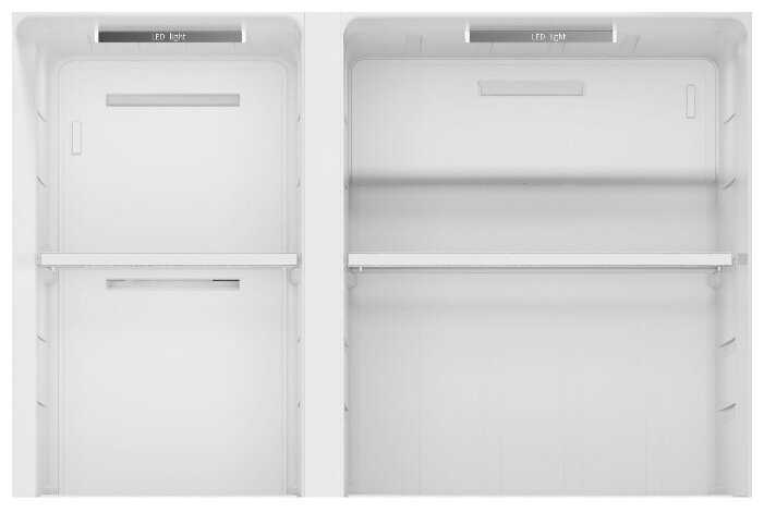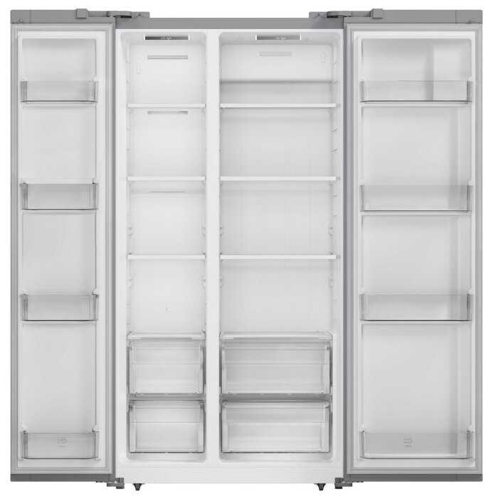 - Side-by-side конструкция с вертикальной морозильной камерой на всю высоту упрощает доступ к продуктам без необходимости перекладывать их.