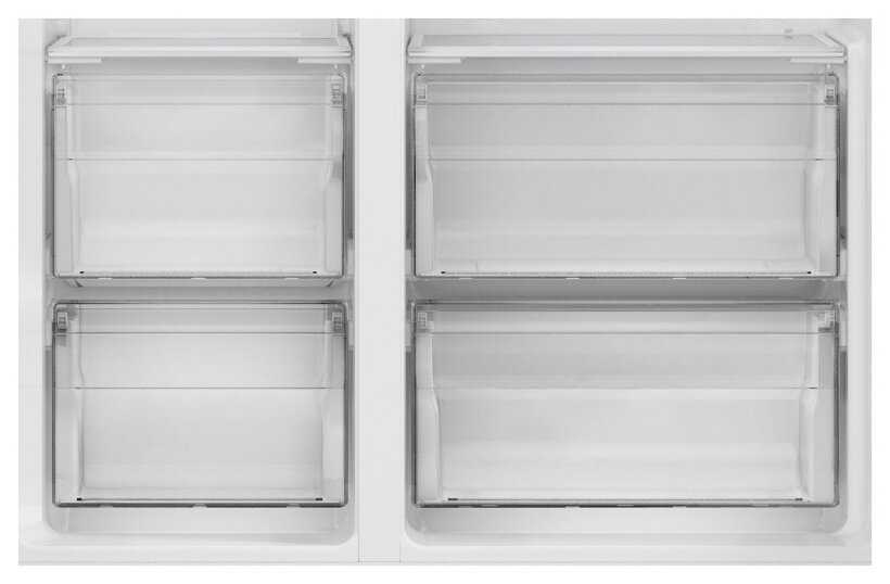 - Выдвижные ящики для овощей и боковые дверные полки оптимизируют хранение.