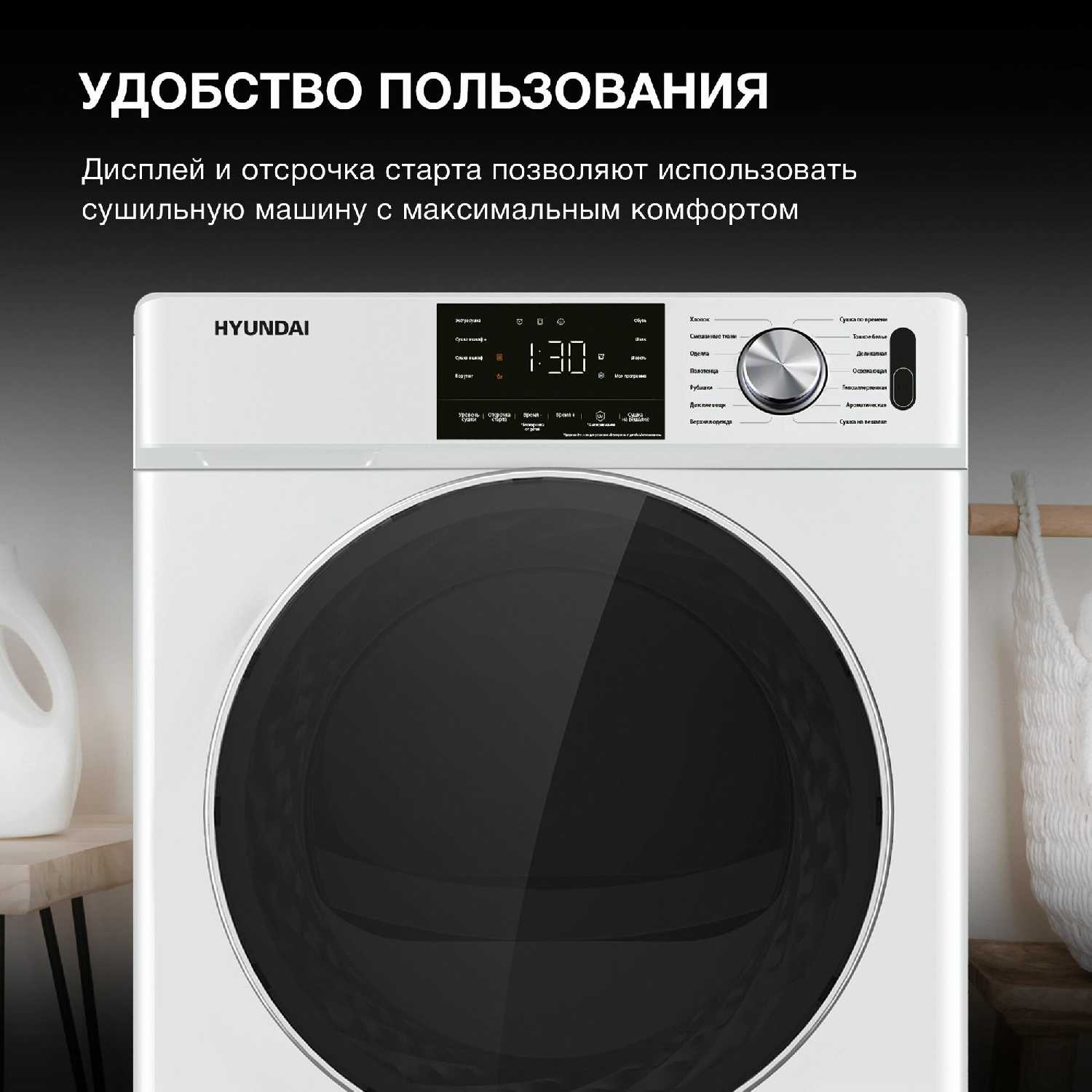 - Защита от перегрева и автоматическая корректировка времени сушки предотвращают повреждение тканей и пересушивание, продлевая срок службы как машины, так и белья.
