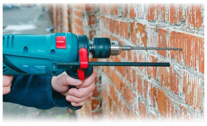 Особенности конструкции : | блокировка кнопки включения, дополнительная рукоятка, ограничитель глубины сверления |
