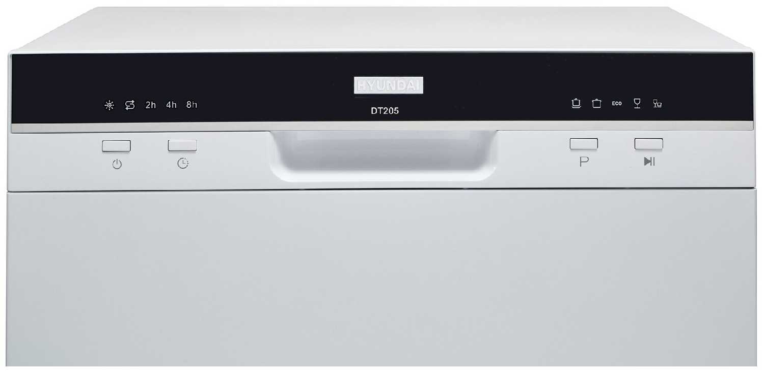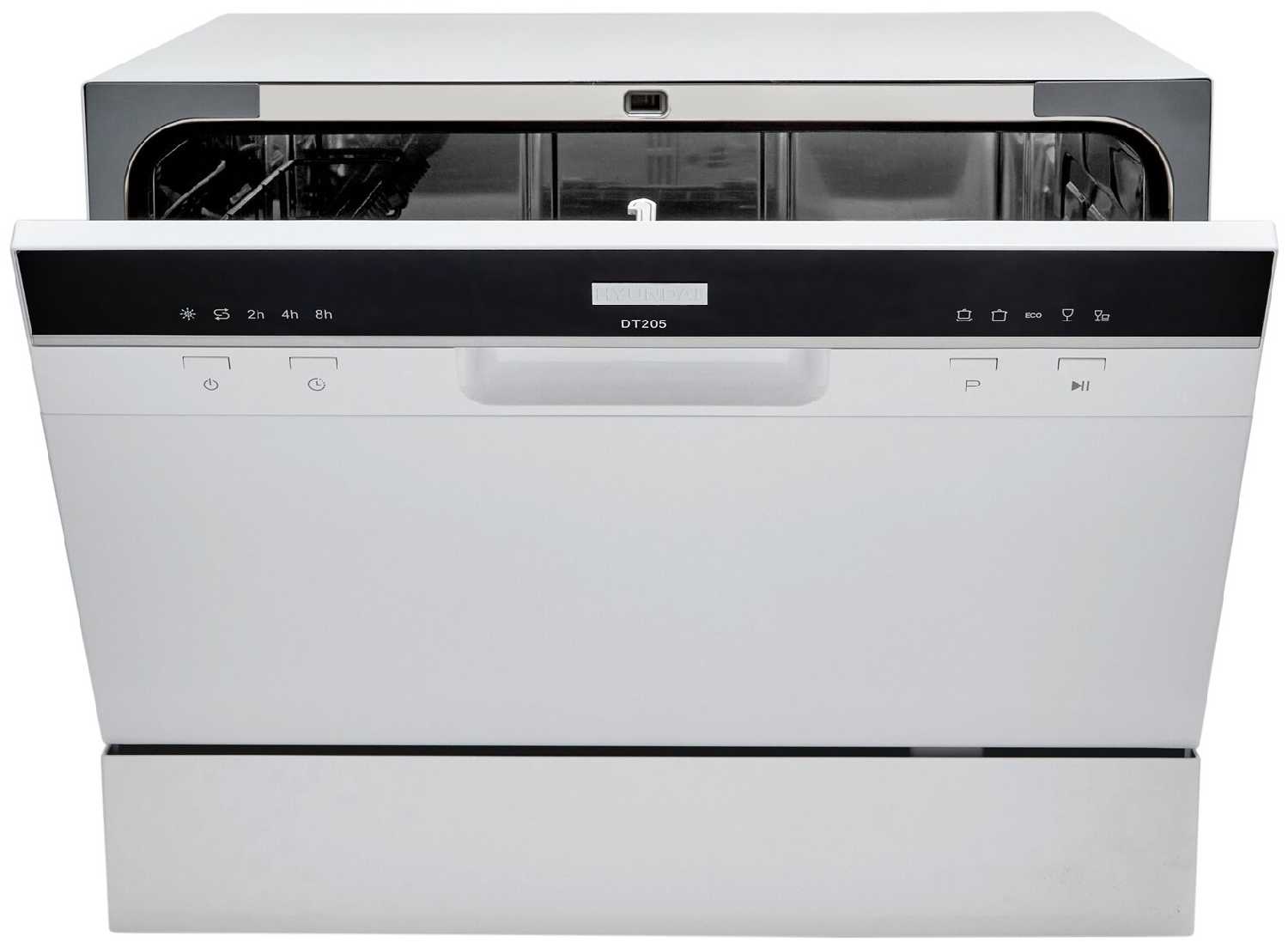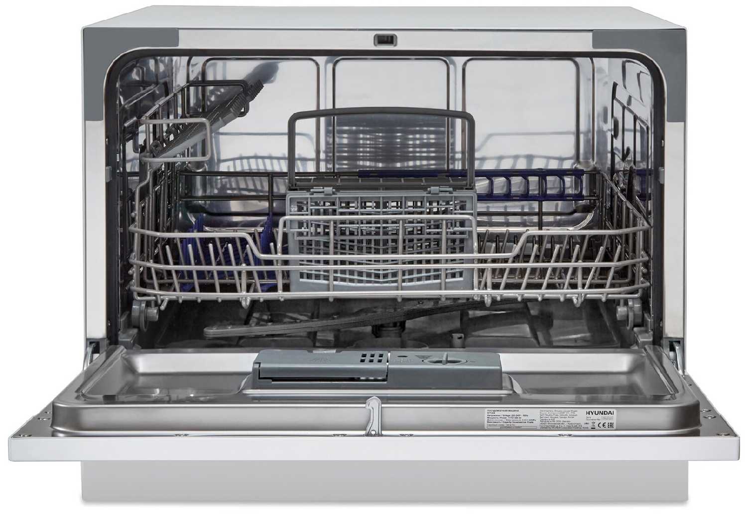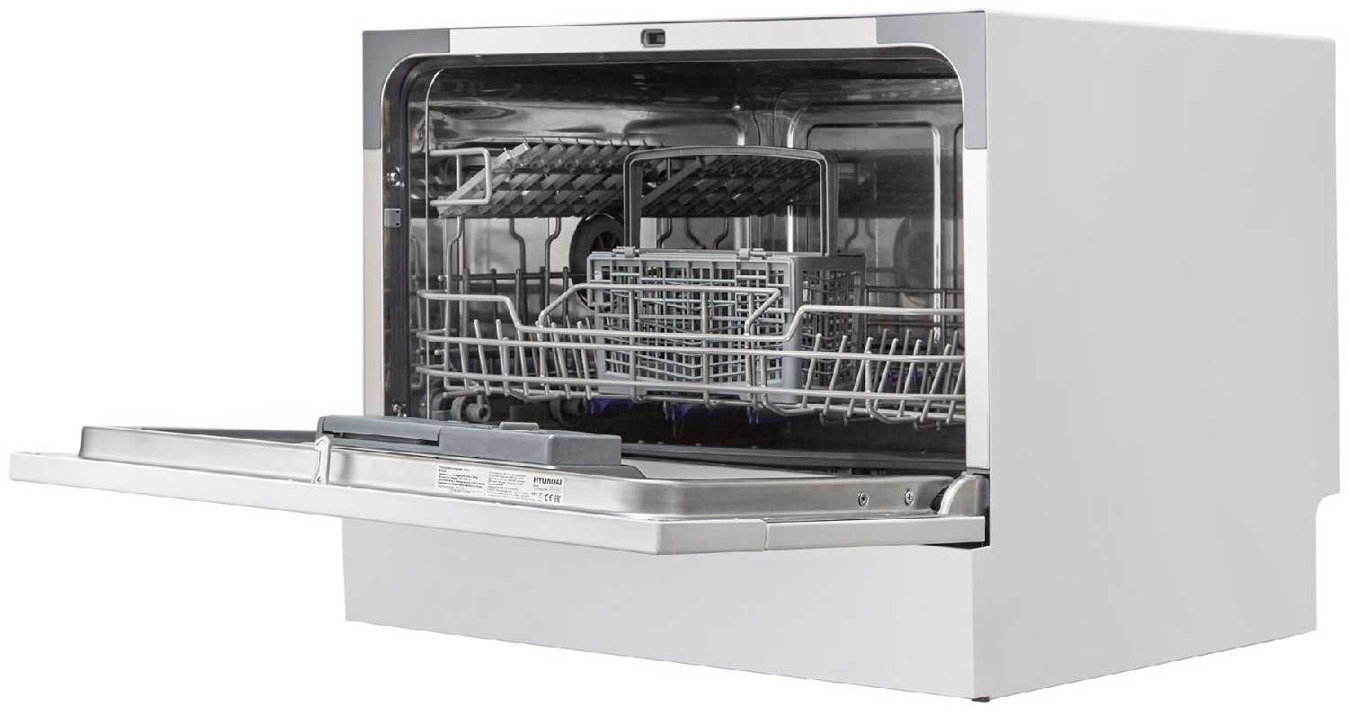 - Несмотря на малые габариты, внутреннее пространство рассчитано на 6–8 комплектов посуды за цикл.