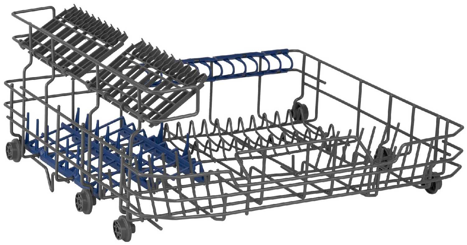- Верхний лоток не регулируется по высоте, что мешает загружать высокие бокалы или кастрюли.