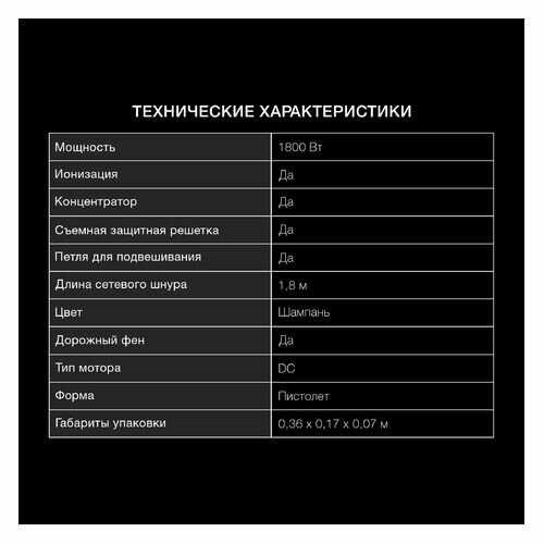 - Мощность двигателя обеспечивает интенсивный поток воздуха, позволяя высушивать густые и длинные волосы до лопаток за 3–5 минут.