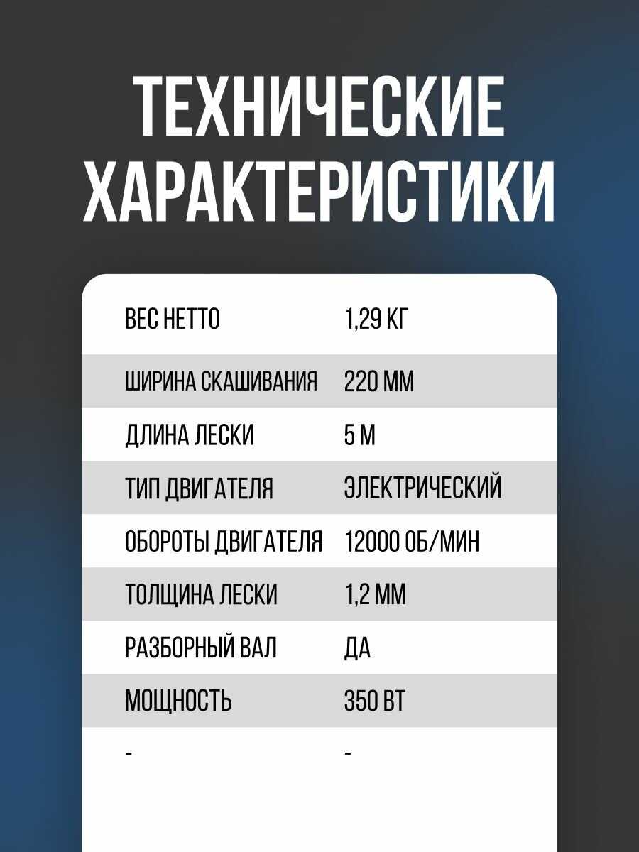 | Подробная комплектация : | электрокоса 1шт., шпулька с леской 1 шт., гарантийный талон 1 шт., руководство пользователя 1 шт., упаковка |