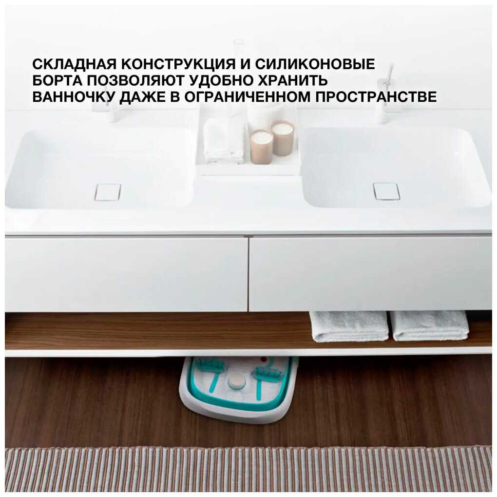 - + Дно ванночки с массажной поверхностью и установлены массажные ролики. Пемза в комплекте. Корпус складной и его проще хранить.