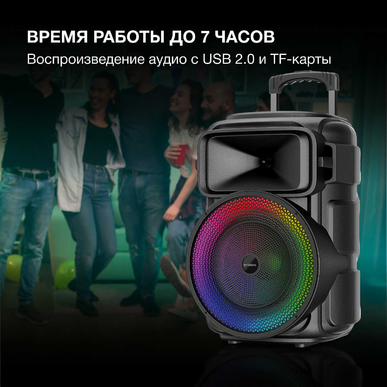 - + Работа на одном заряде около 7-ти часов. Работает через блютуз, аукс и флешки. Мощность.