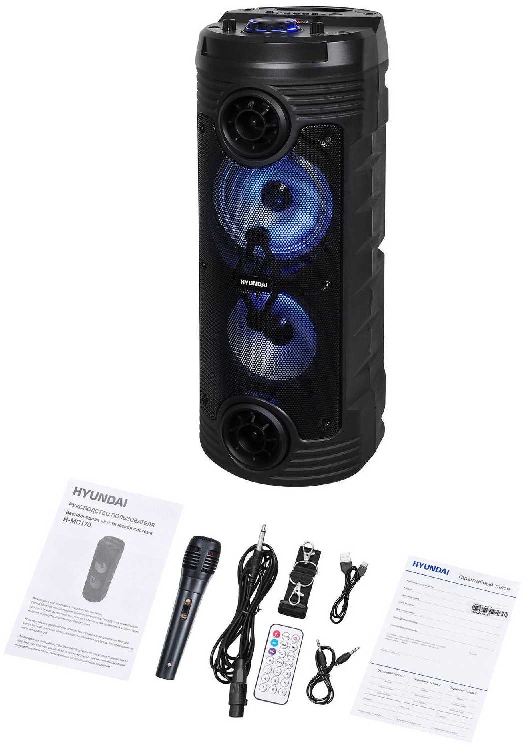 В комплекте идёт кабель, переходник, микрофон и пульт для управления колонкой