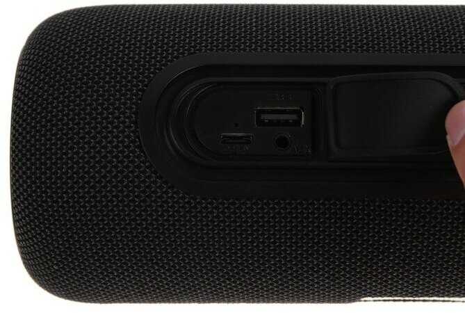 Устройство поддерживает TWS-синхронизацию для создания стереопары, хотя соединение требует ручного сопряжения. FM-радио работает нестабильно: в городских условиях ловит 2-3 станции с помехами, а для улучшения приёма требуется использовать AUX-кабель как антенну. Разъёмы (USB Type-C для зарядки, AUX, USB-A для флешек) закрыты герметичной заглушкой, обеспечивающей защиту IPX5 от брызг и дождя. Отмечаются проблемы с навигацией по папкам при воспроизведении с USB-накопителей – функция перехода между уровнями директорий отсутствует. Голосовые уведомления на русском языке ("низкий заряд", "подключено") отличаются умеренной громкостью, но индикатор заряда реализован неудачно: синий светодиод сигнализирует только о включении, а уровень батареи невозможно определить без сторонних приложений.