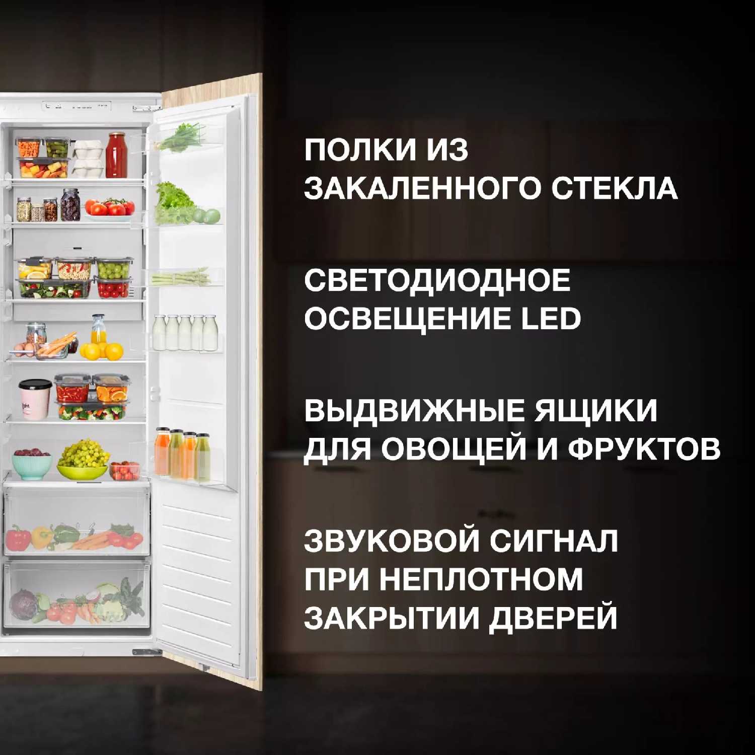 Одной из полезных функций, отмеченных пользователями, является звуковой сигнал, оповещающий о неплотно закрытой двери. Это особенно актуально для встраиваемых моделей, где визуально не всегда сразу заметно, закрыта ли дверь из-за фасада. Данная функция предотвращает потерю холода и порчу продуктов. Яркая светодиодная подсветка обеспечивает хорошую видимость содержимого даже в темное время суток.