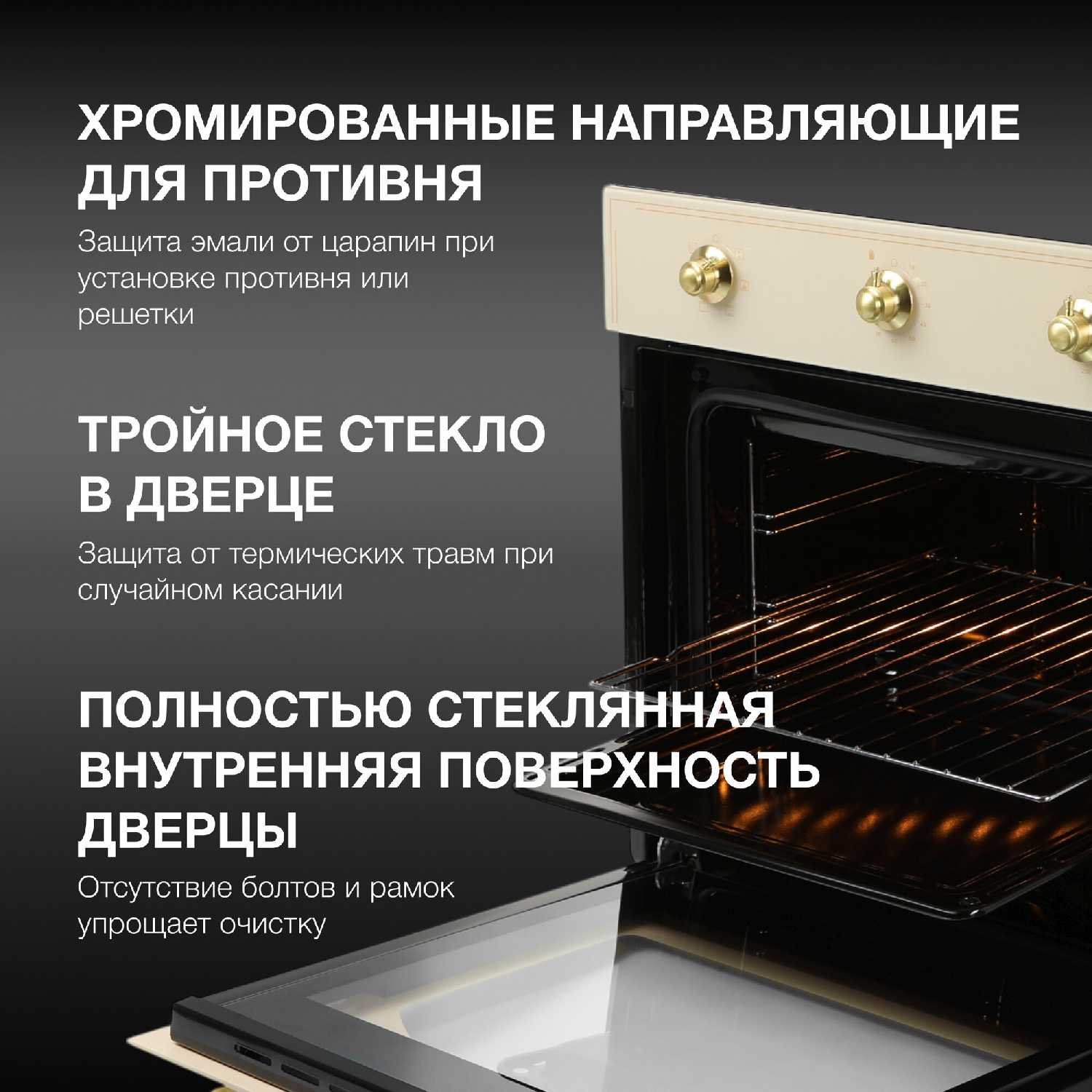 - 4 позиции решёток на усиленных направляющих из нержавеющей стали — выдерживают противень весом 5 кг без деформации.