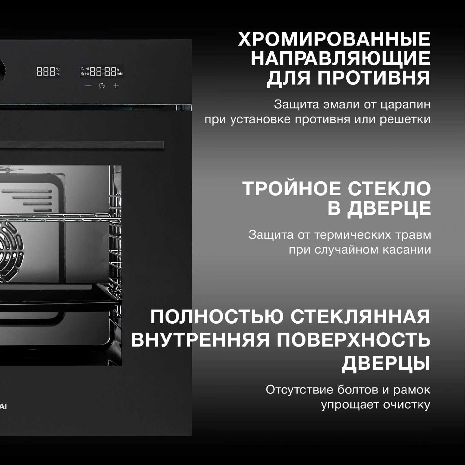 - + 12 режимов нагрева, большой объем внутри, управление электронное есть не большой дисплей, в дверце тройное стекло, можно не переживать что если ребенок дотронется, не обожжется.