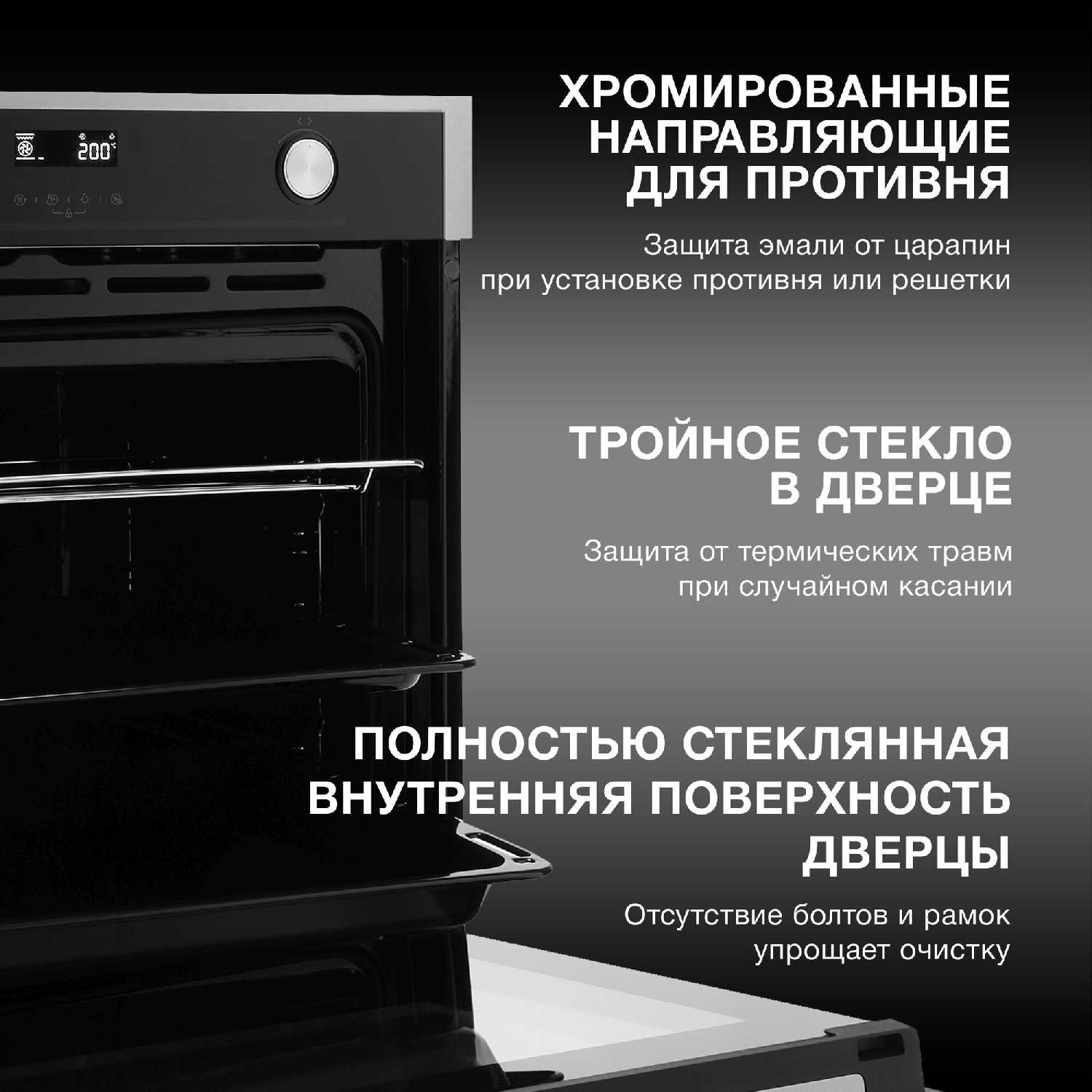 - + 12 режимов нагрева, утапливаемые ручки, тройное стекло, направляющие хорошо удерживают противень при выдвижении.