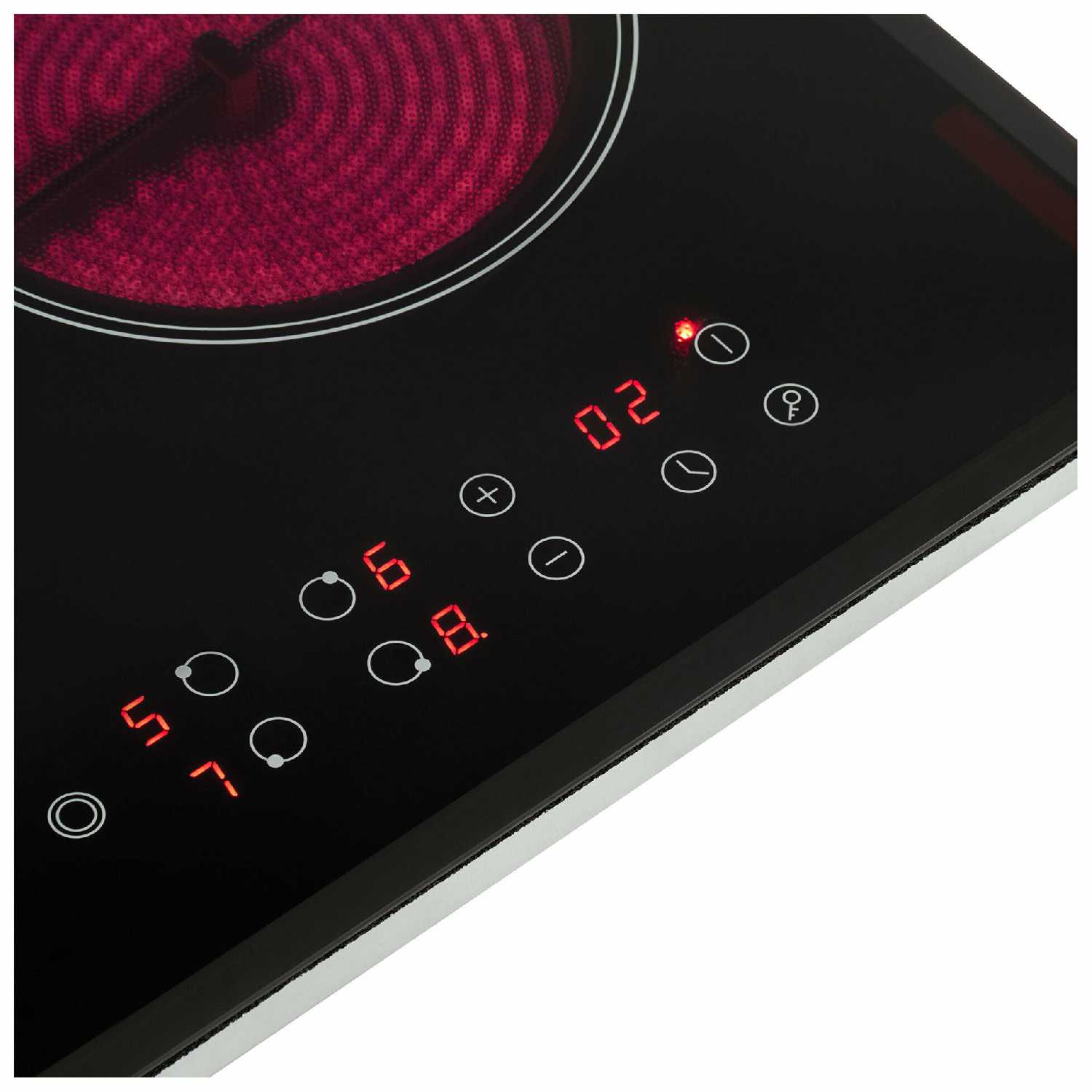 Включенные конфорки подсвечиваются красным, а цифровой дисплей отображает выбранный уровень мощности (от 1 до 9) и оставшееся время таймера. При остаточном тепле индикатор горит до полного остывания, что визуально предотвращает случайные прикосновения к горячей зоне. Яркость экрана достаточна для чтения при дневном свете. -