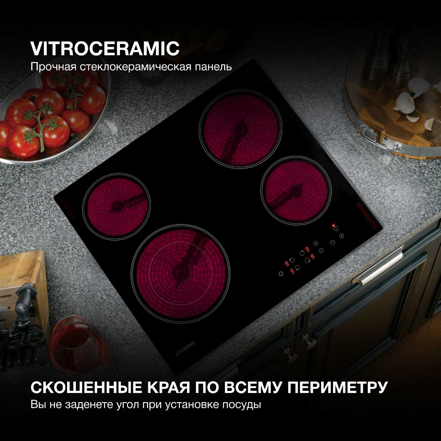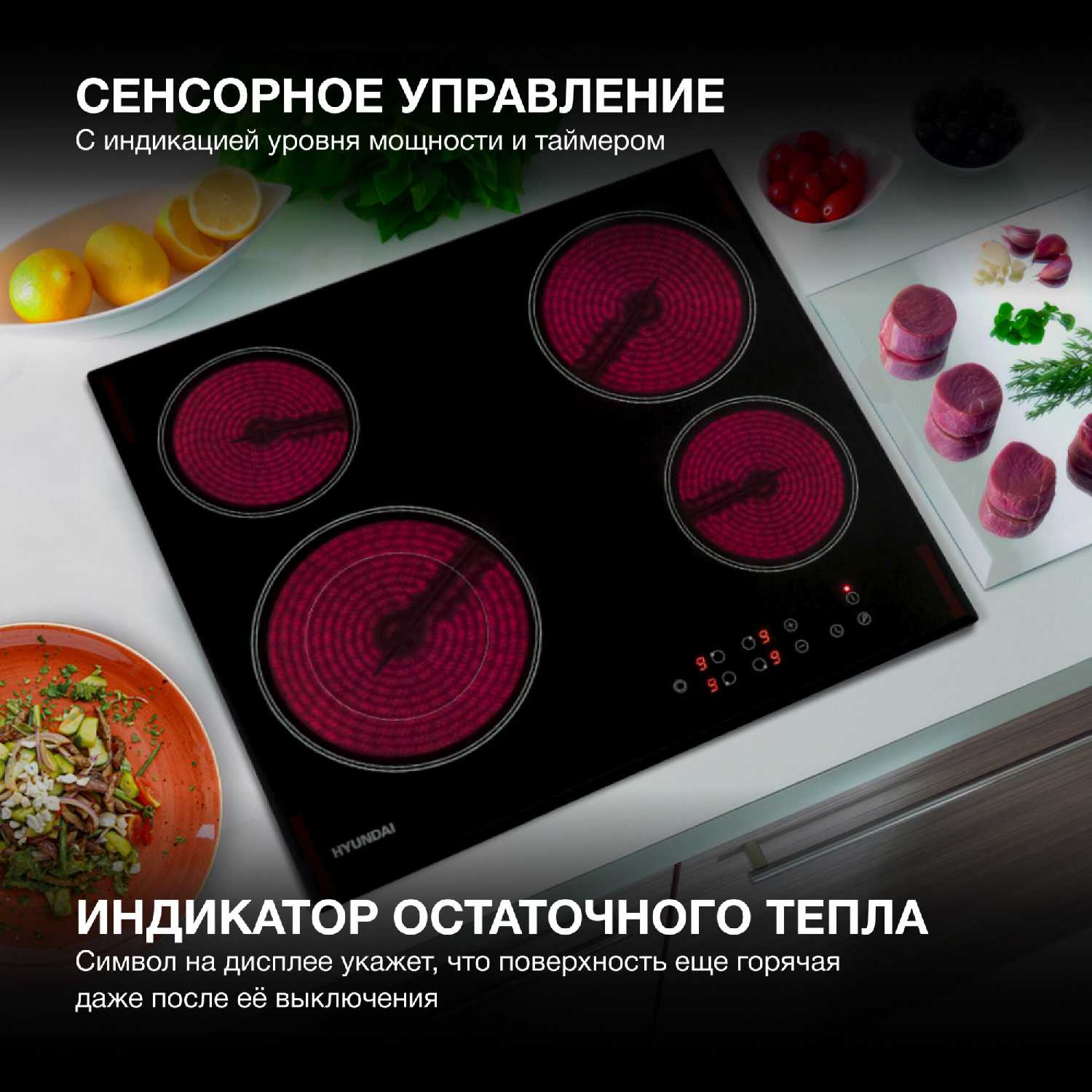 - Индикаторы остаточного тепла (H-символы) сигнализируют о горячих зонах после выключения.