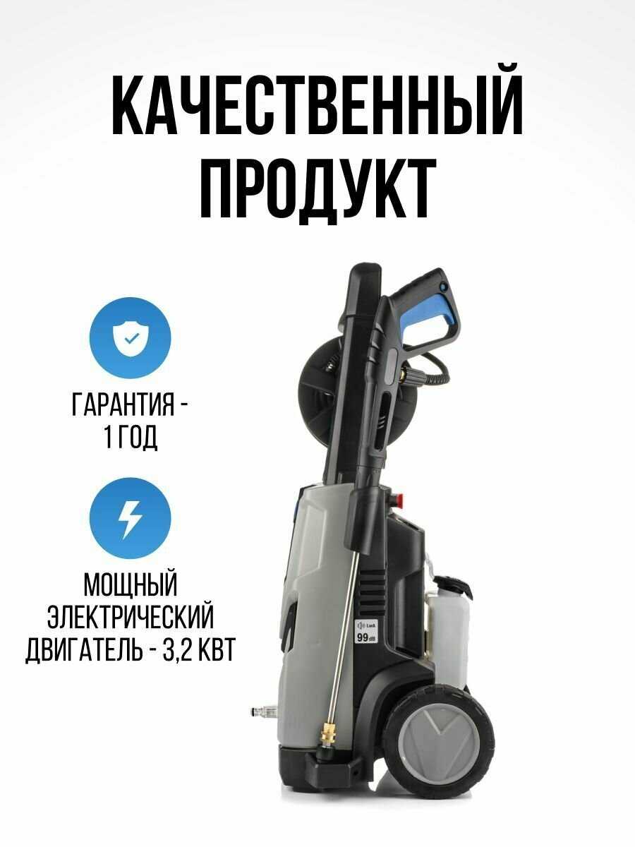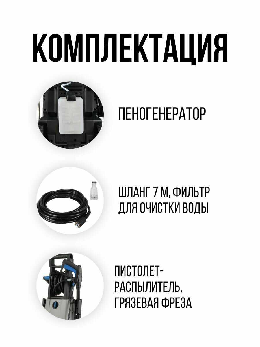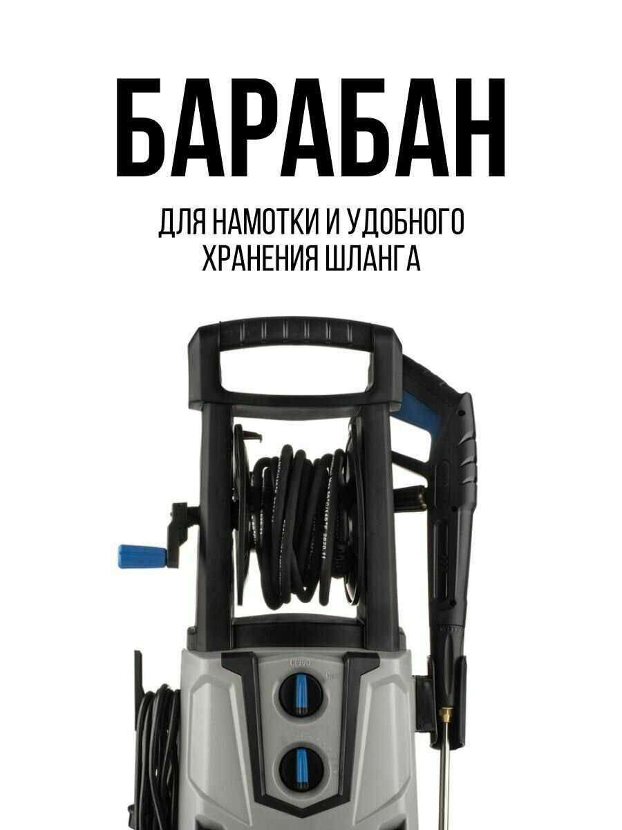 - Длинный шланг высокого давления (ориентировочно 6-8 метров) позволяет мыть автомобиль по периметру без перемещения самой мойки.