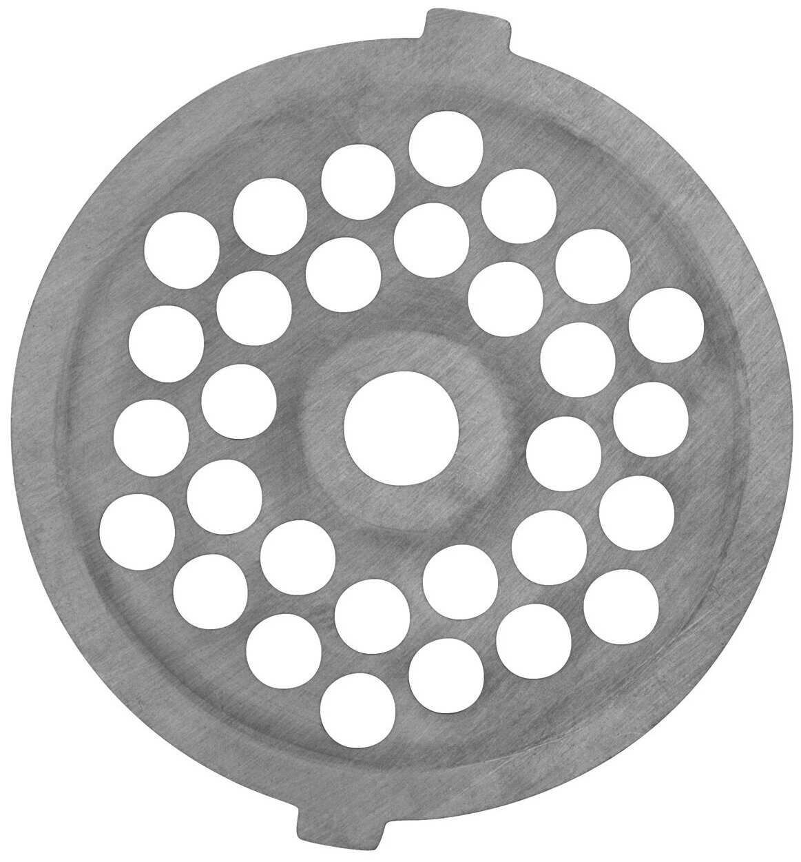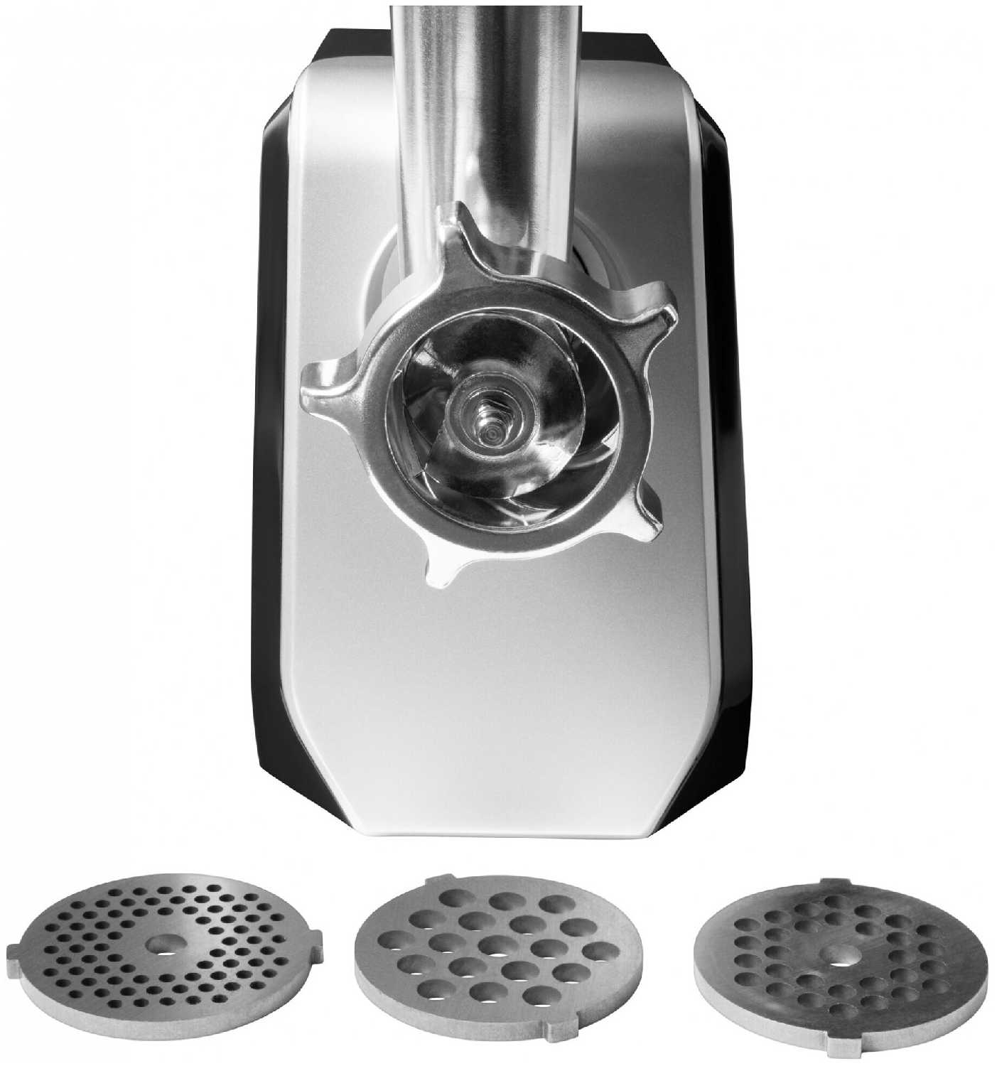 - Металлические решетки для фарша разного диаметра позволяют регулировать консистенцию (от воздушной до плотной).