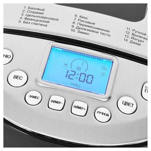 - 14 программ включают безглютеновый режим, приготовление джема, йогурта, кексов и теста для пельменей, расширяя кулинарные возможности.