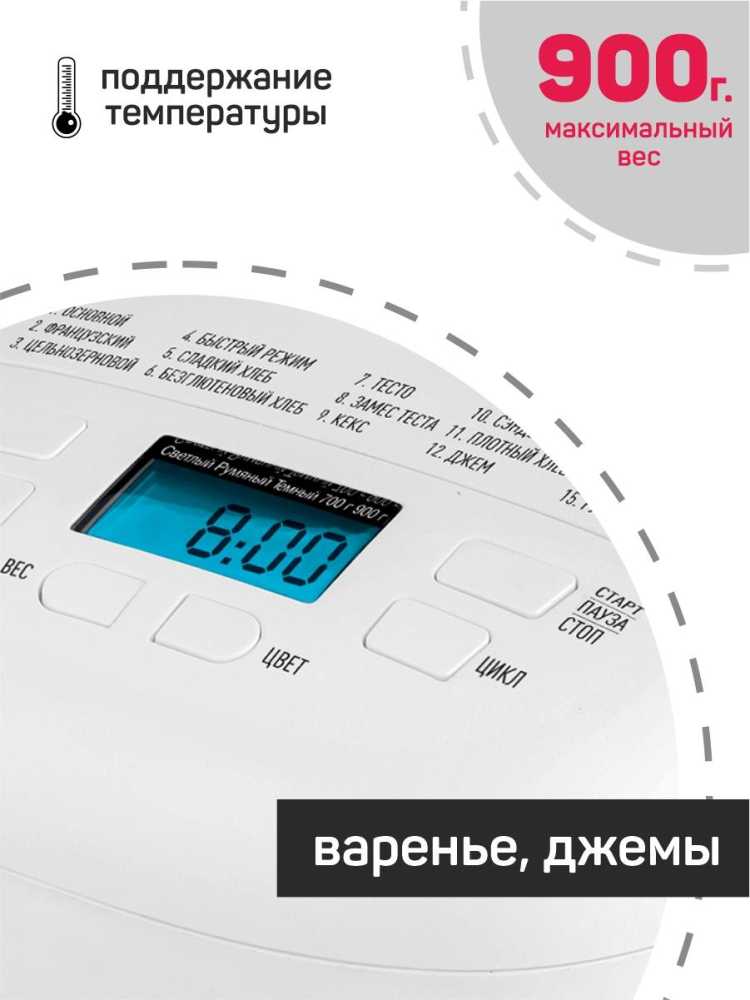 Режим на 900 г подходит для больших семей, но некоторые отмечают риск недопекания середины или «побега» теста. Для буханки 500–700 г надежнее использовать программу 750 г — так хлеб пропекается равномерно. В отзывах советуют для французских рецептов на 700 г ставить программу 900 г для идеального результата. -