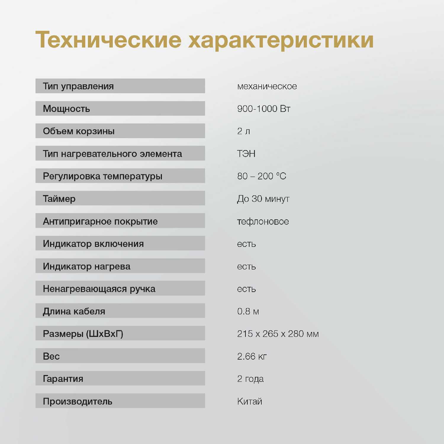 - + Автоматически отключается, когда корзину достаешь или заканчивается таймер. Аккуратный и лаконичный дизайн. Легко отмывается емкость от жира, нет укромный и недоступных уголков. Запаха пластика во время нагрева и работы нет. Объем чаши 10 л, две ручки.