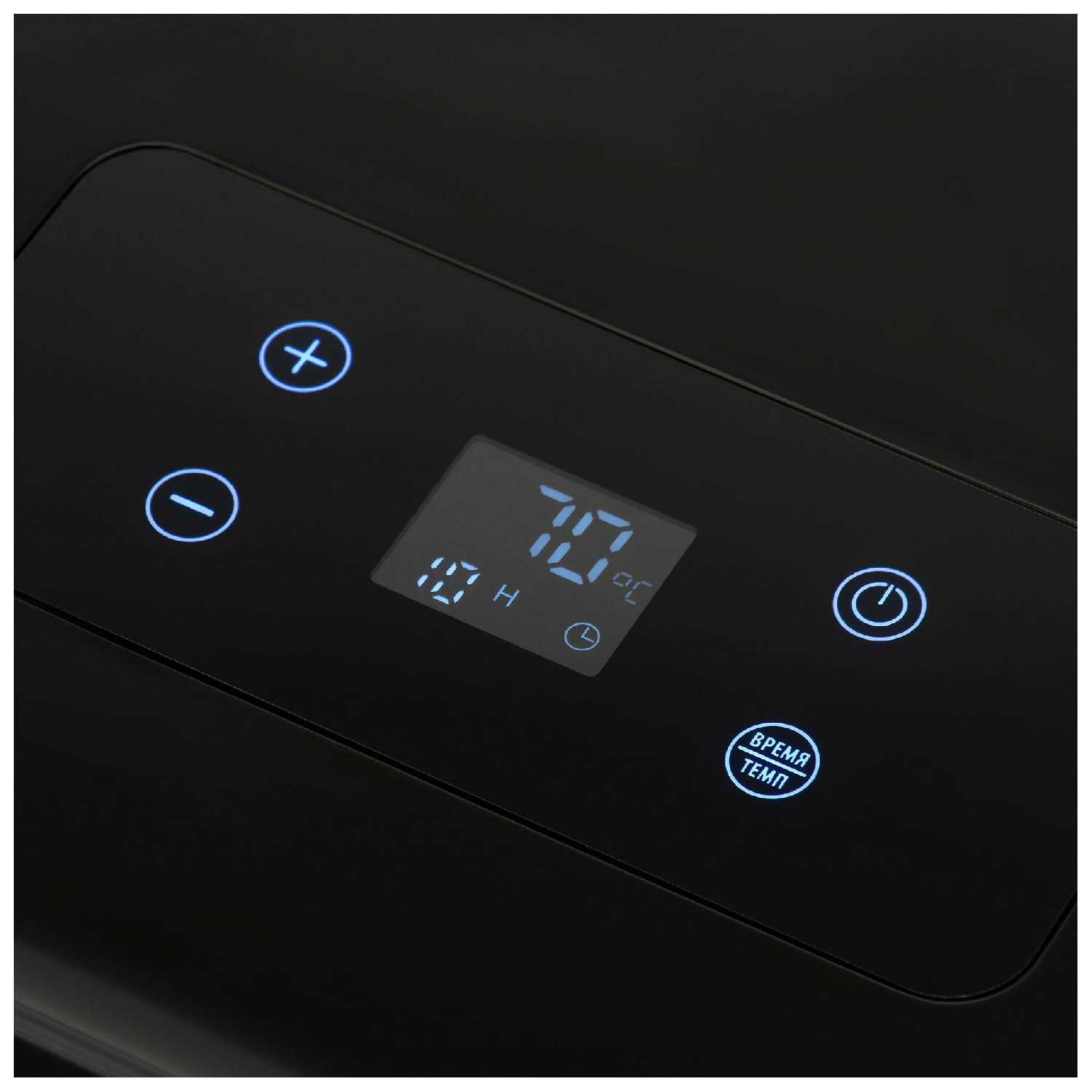 - + 4 кнопки в управлении, дисплей имеется, легко открывается и закрывается, жара не выходит через дверцу, ширина поддона 18 см.