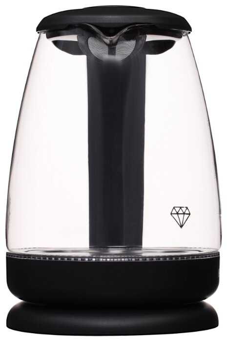 Стильный чайник с металлическим корпусом. Чтоб понять сколько в нем воды надо заглядывать под крышку, корпус черный и непрозрачныйй. Включается кнопкой она удобно расположена под ручкой. Носик чайника узкий, удобно наливать, не разбрызгивает воду. Благодаря скрытому нагревательному элементу чистить чайник не проблема хватает прокипятить с лимонкой и он снова сверкает. Крышка съемная, это удобно для залива воды.