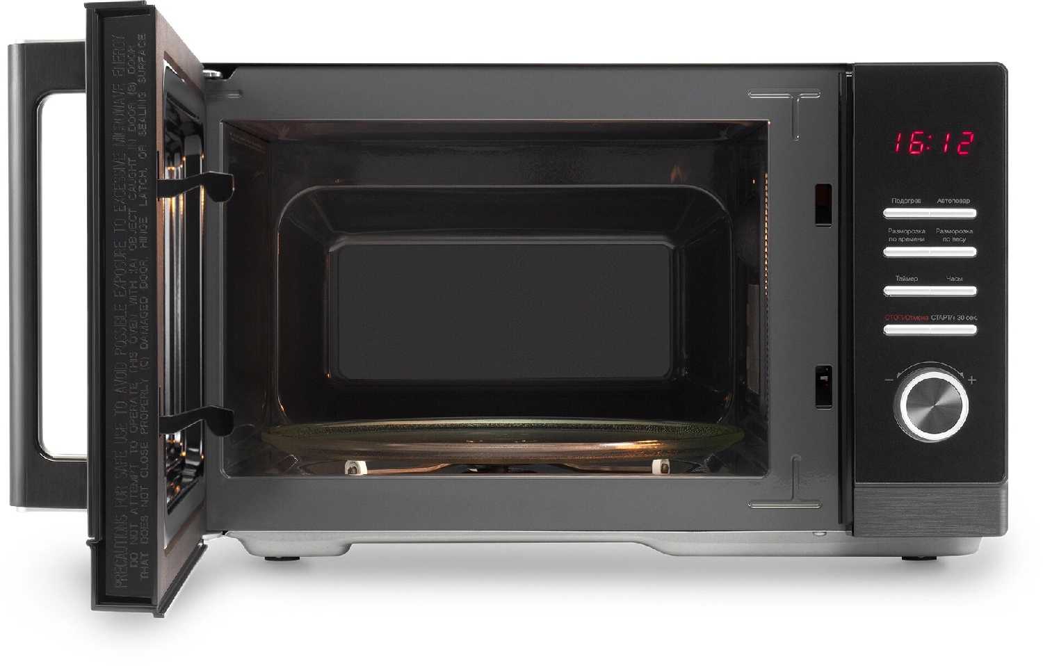 Объем микроволновки составляет 25 литров, что пользователи считают оптимальным для большинства задач. В камеру свободно помещаются стандартные большие тарелки с супом или полноценным обедом. Такой объем позволяет размораживать крупные продукты и даже готовить некоторые блюда. Вращающийся столик надежно удерживает посуду во время работы без смещения. -