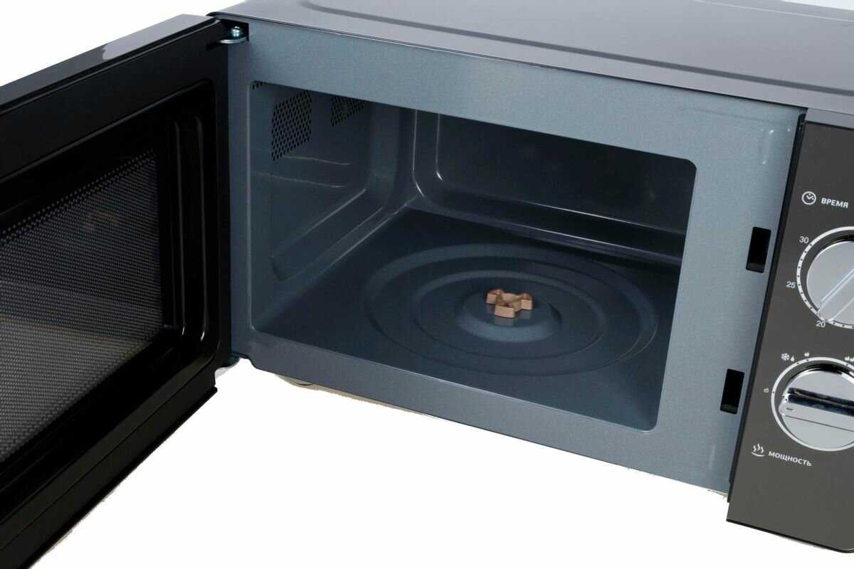 Внутренняя камера покрыта прочной эмалью серого цвета, которая демонстрирует хорошие практические качества. Это покрытие устойчиво к царапинам и нагреву, не впитывает запахи и легко очищается. Равномерное распределение нагрева по эмалированной поверхности способствует качественному разогреву пищи без локальных перегревов, что подтверждается многочисленными отзывами пользователей. -