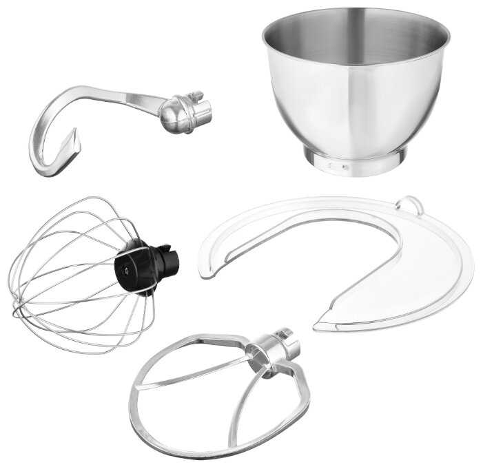 - Крюк для теста, венчик и лопатка легко снимаются, моются под проточной водой.