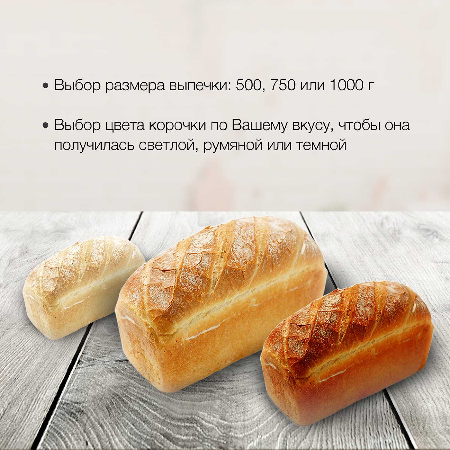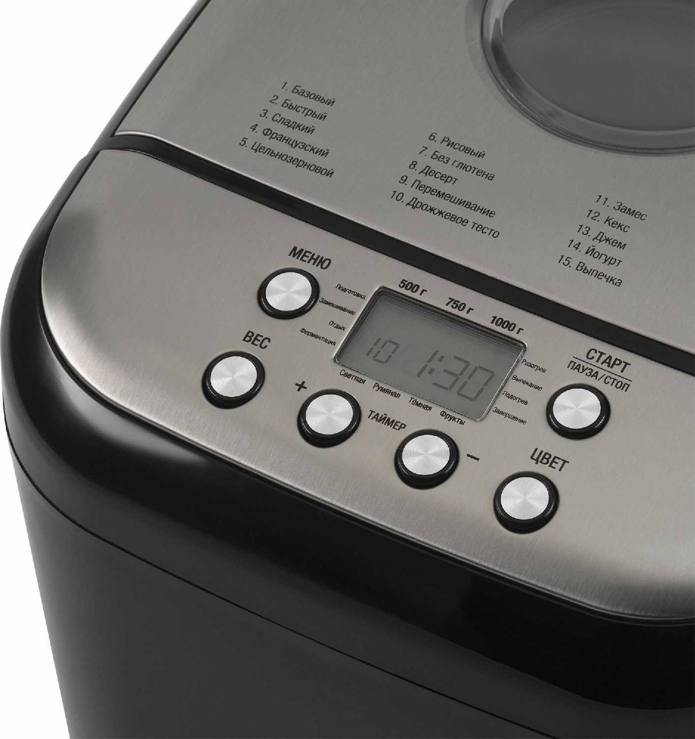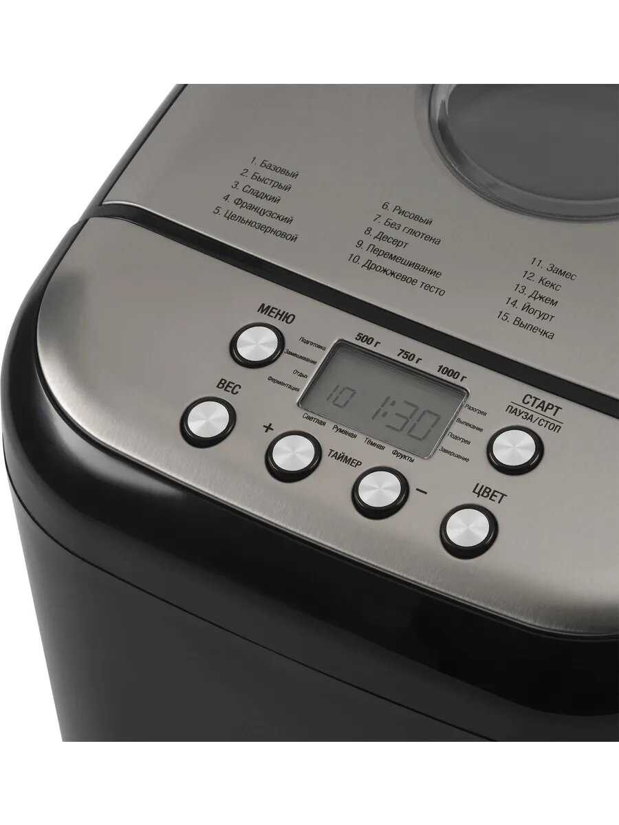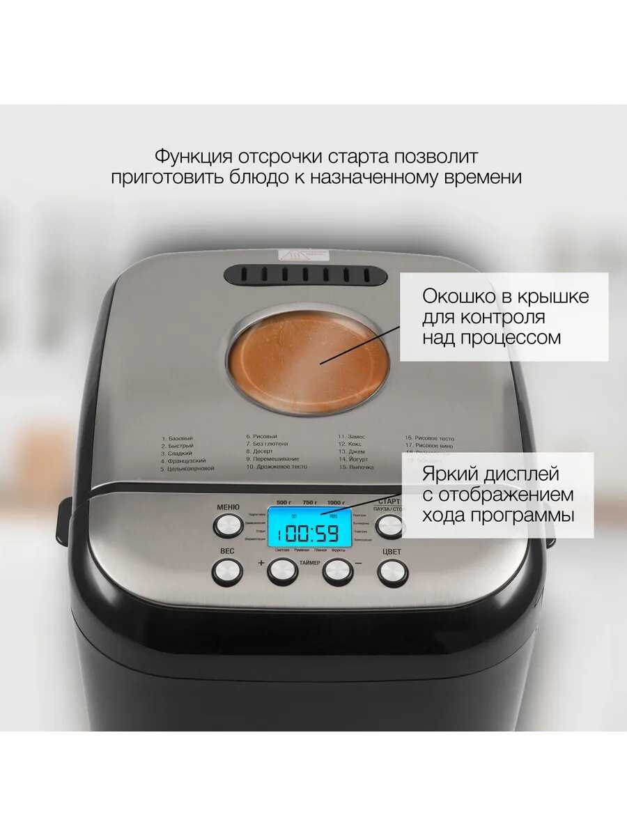 - + Таймер отсрочки старта, цена, регулировка веса выпечки
