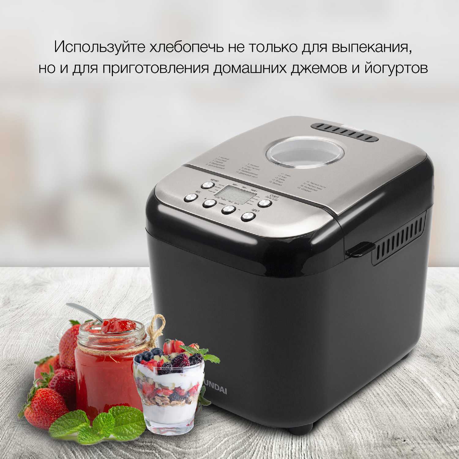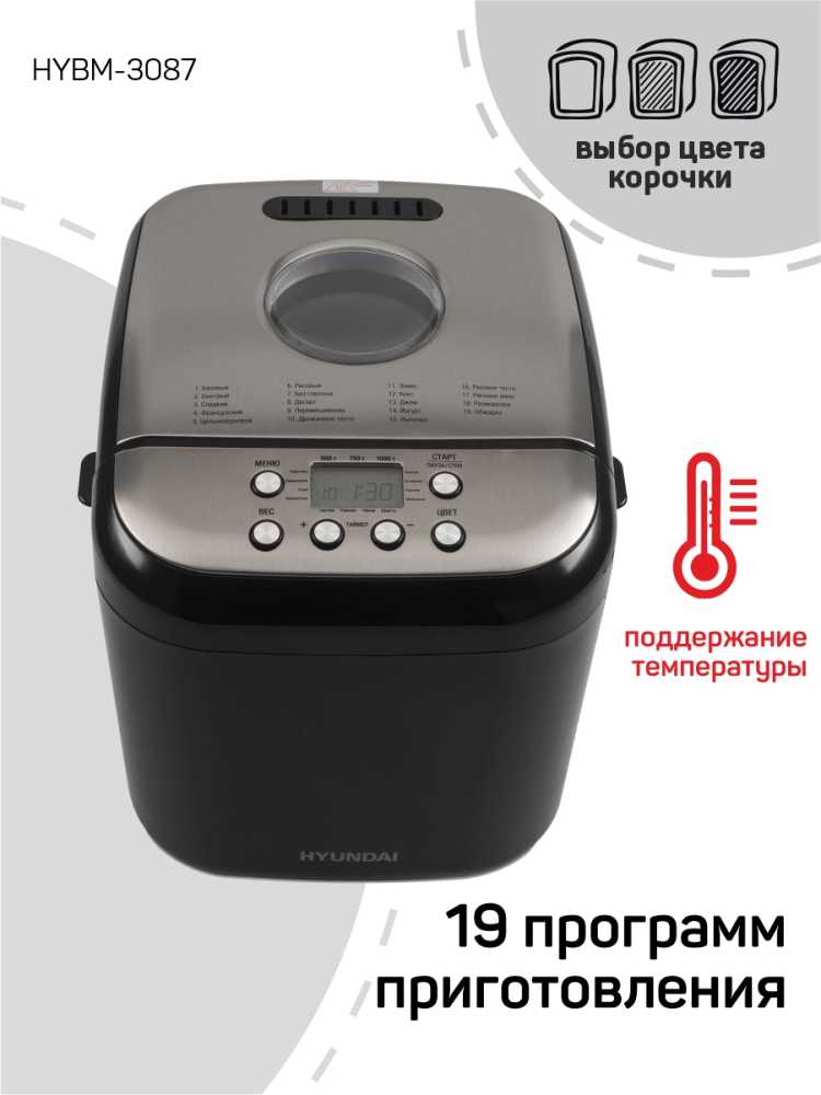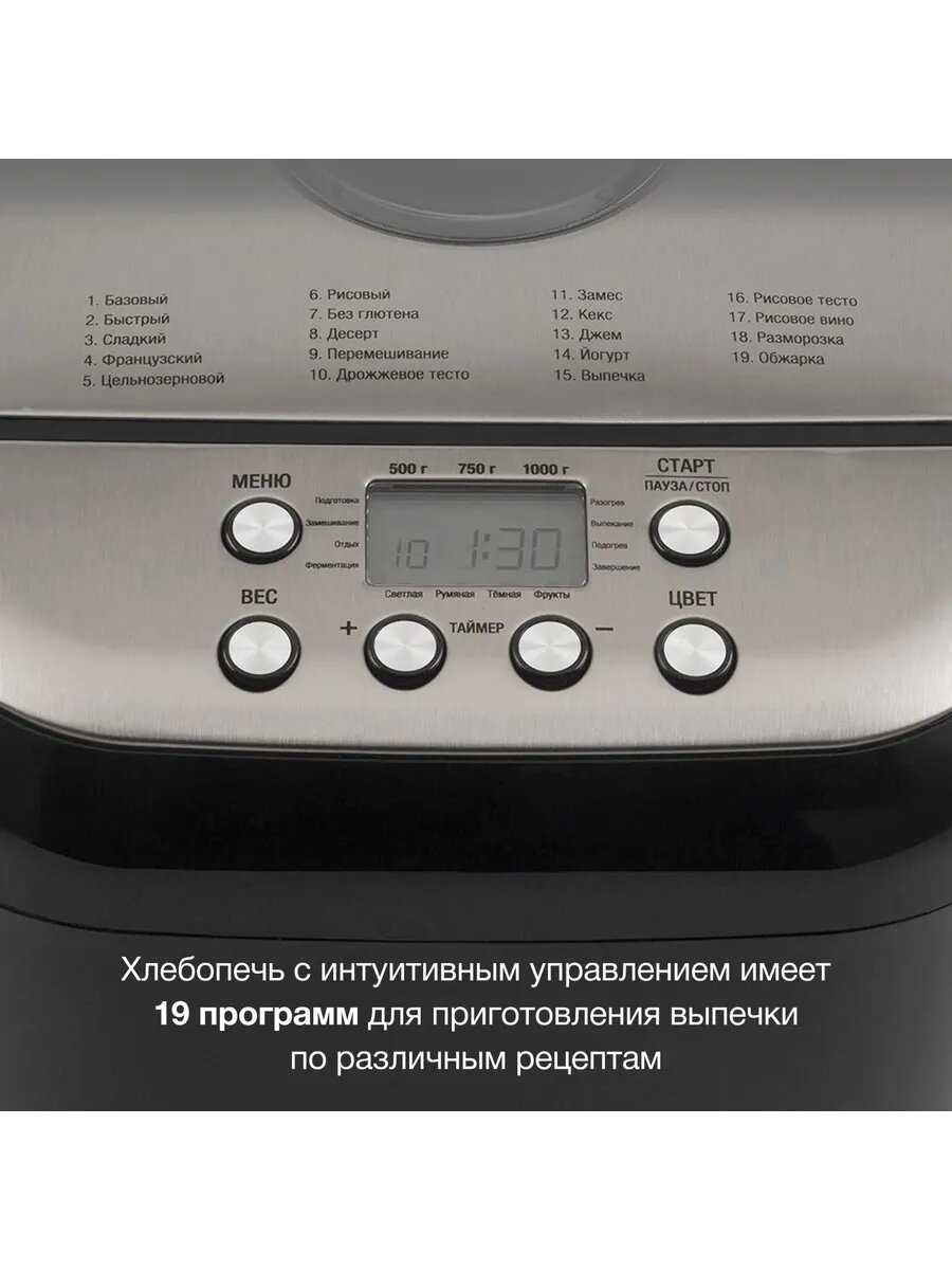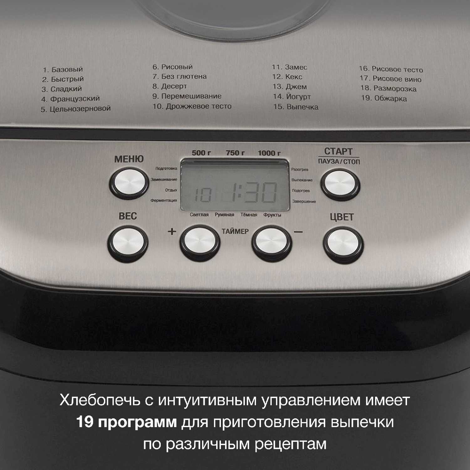 - + 19 программ для приготовления, окошко для наблюдения, настройка веса выпечки и регулировка цвета корочки.