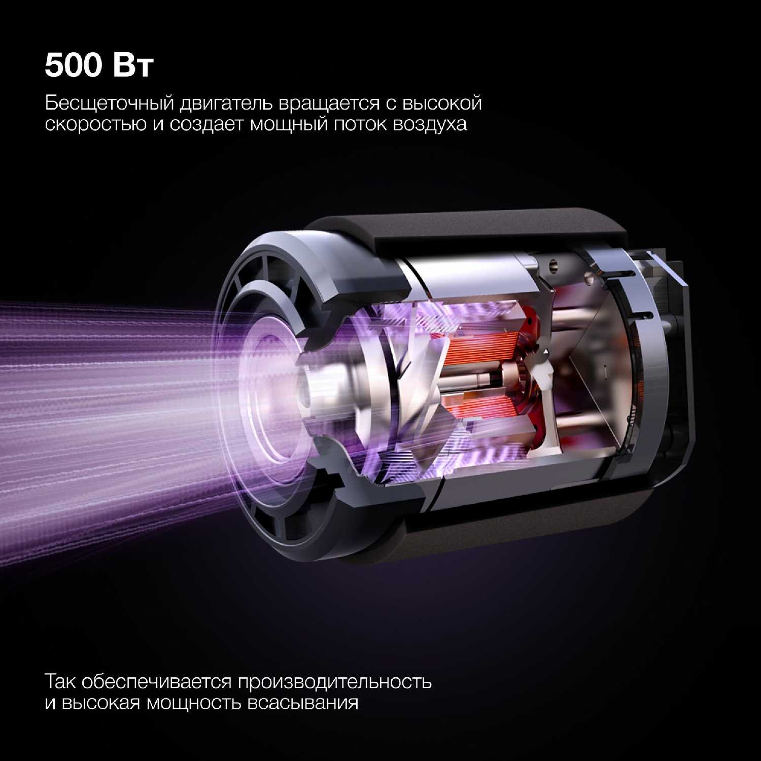 - Режим турбо на 100 Вт всасывания справляется с длинными волосами, предотвращая их наматывание и обеспечивая бесперебойную работу механизма.