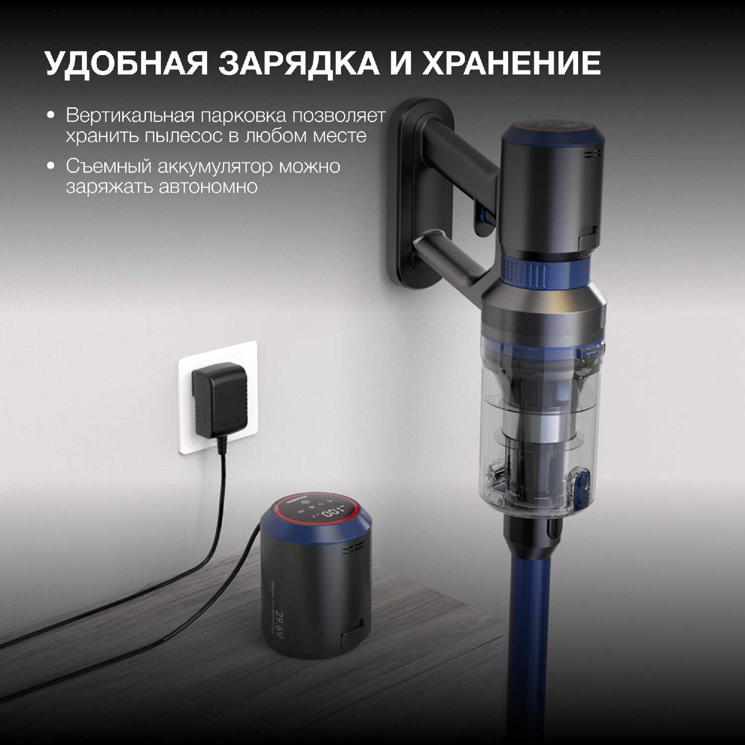 - Индикация заряда на дисплее помогает планировать уборку, предотвращая неожиданную остановку и поддерживая стабильную мощность на среднем режиме.