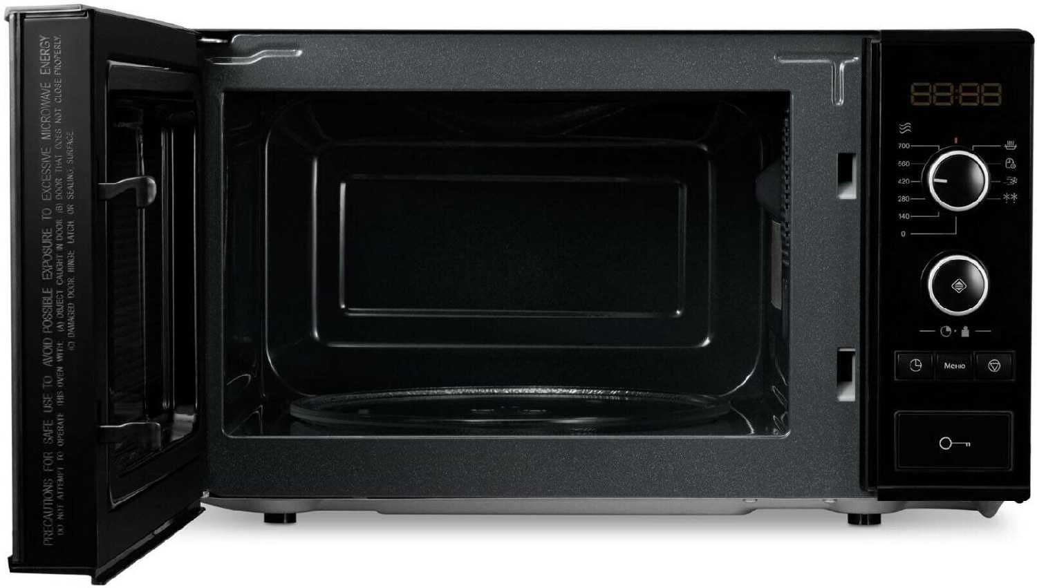 - + 6 режимов мощности, удобно октрывается дверь, симпатично выглядит, быстро греет еду.