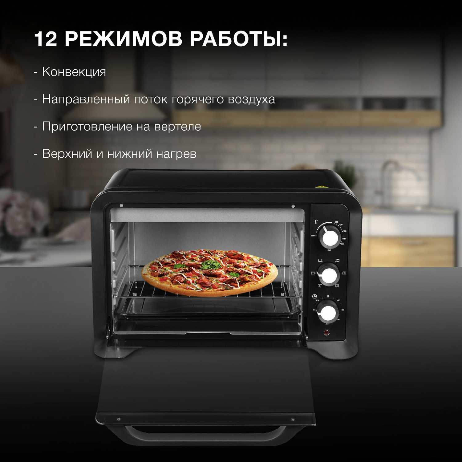 - 12 режимов работы, включая раздельный верхний/нижний нагрев, обеспечивают адаптацию под разные типы блюд (хлеб, пироги, мясо).