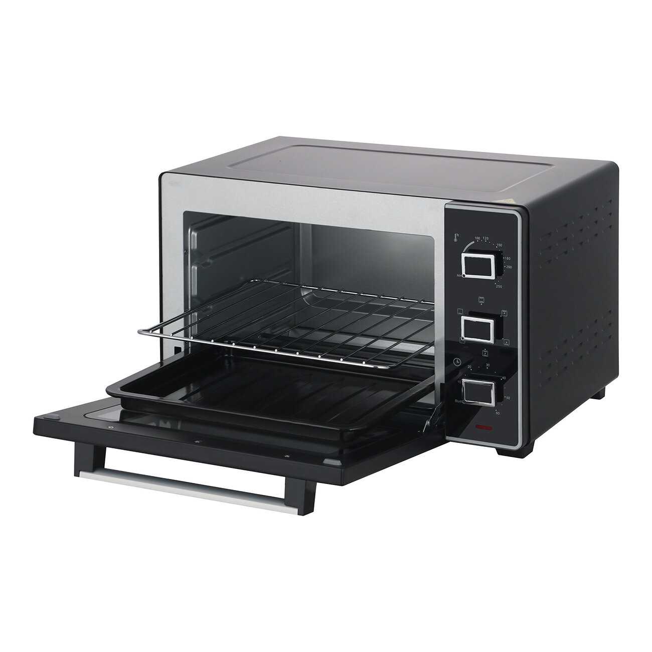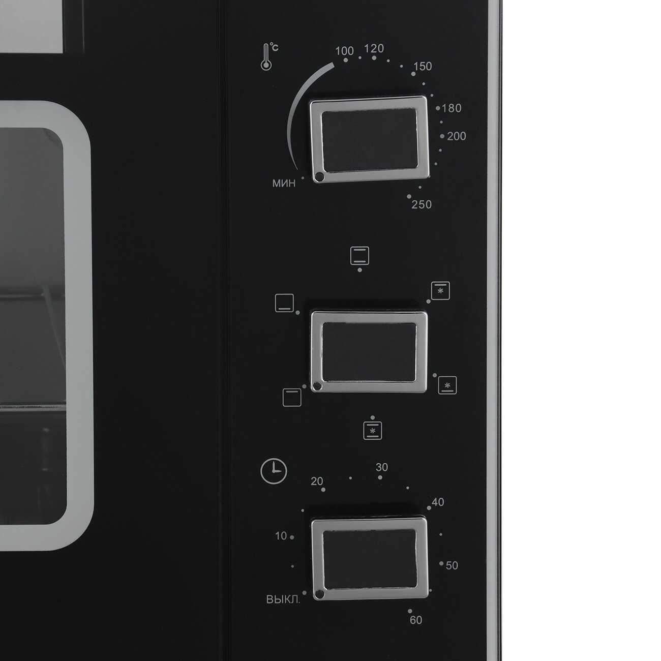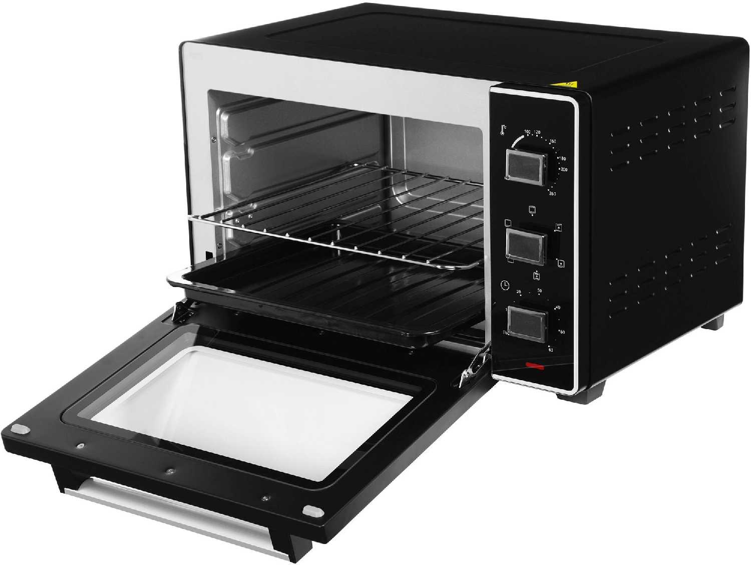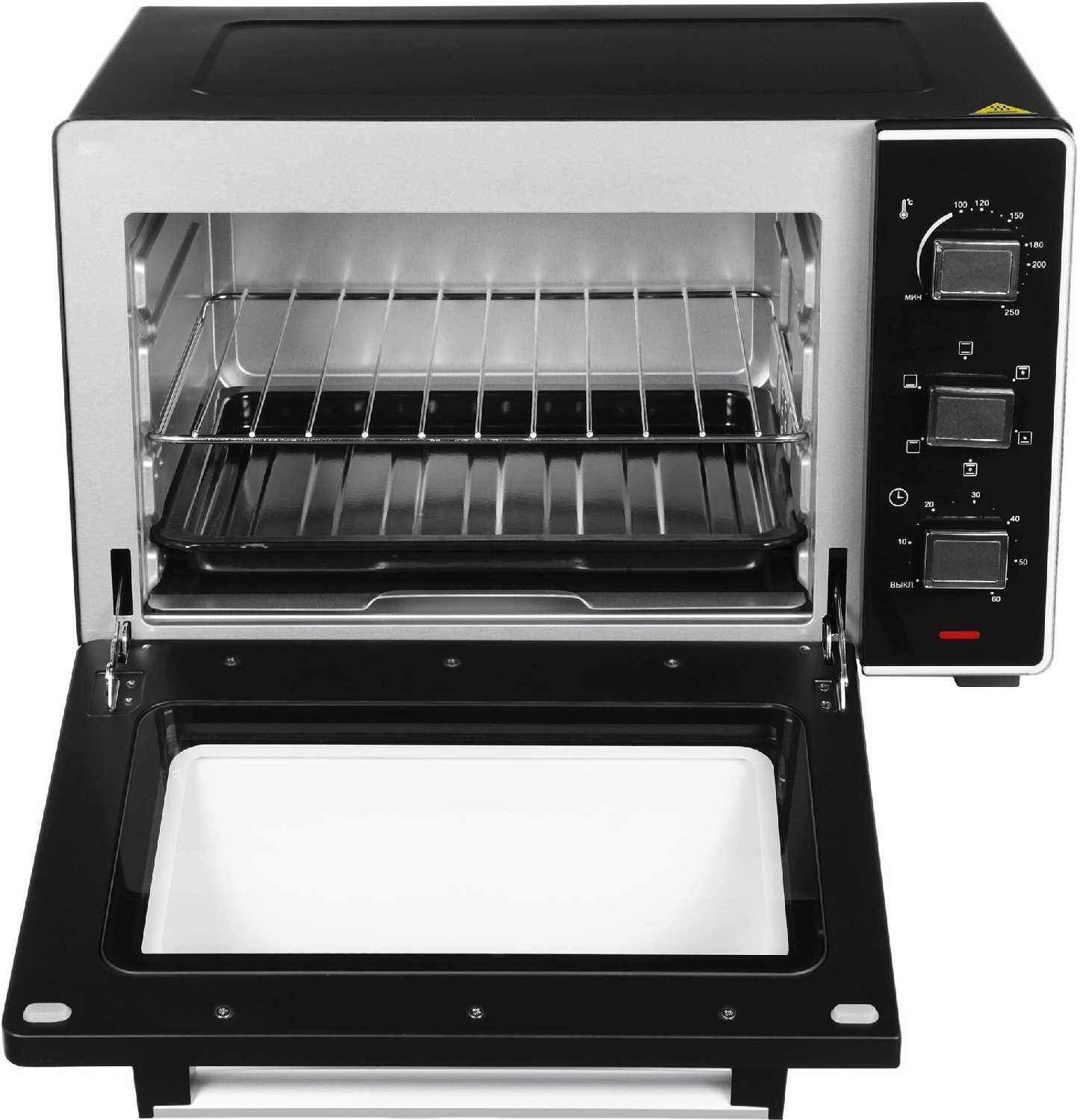 - + Корпус черный, выглядит солидно. Внутри светлая камера, видно процесс запекания. Есть решетка и противень в комплекте. Управление – три крутилки: температура, режим и таймер, всё интуитивно понятно. Дверца плотная, не хлопает. Поддон для крошек есть, чистится легко.